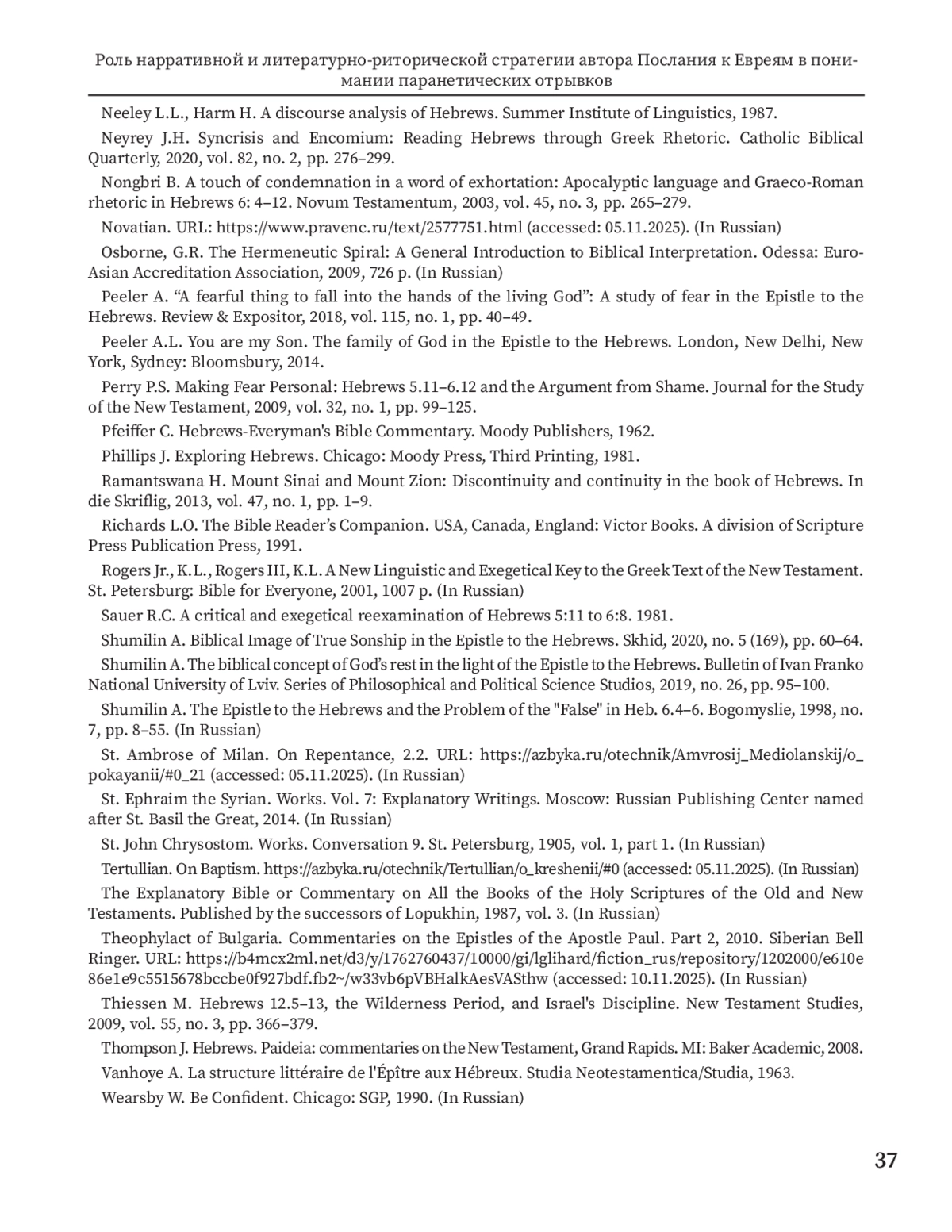 35. Guzmán R., Martin M.W. Is Hebrews 5: 11-6: 20 Really a Disgression? // Novum Testamentum. 2015. Т. 57. № 3. P. 295-310.