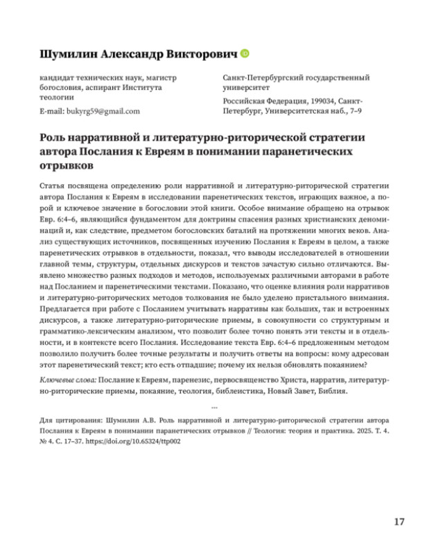 Статья посвящена определению роли нарративной и литературно-риторической стратегии автора Послания к Евреям в исследовании паренетических текстов, играющих важное, а порой и ключевое значение в богословии этой книги. Особое внимание обращено на отрывок Евр. 6:4–6, являющийся фундаментом для доктрины спасения разных христианских деноминаций и, как следствие, предметом богословских баталий на протяжении многих веков. Анализ существующих источников, посвященных изучению Послания к Евреям в целом, а также паренетических отрывков в отдельности, показал, что выводы исследователей в отношении главной темы, структуры, отдельных дискурсов и текстов зачастую сильно отличаются. Выявлено множество разных подходов и методов, используемых различными авторами в работе над Посланием и паренетическими текстами. Показано, что оценке влияния роли нарративов и литературно-риторических методов толкования не было уделено пристального внимания. Предлагается при работе с Посланием учитывать нарративы как больших, так и встроенных дискурсов, а также литературно-риторические приемы, в совокупности со структурным и грамматико-лексическим анализом, что позволит более точно понять эти тексты и в отдельности, и в контексте всего Послания. Исследование текста Евр. 6:4–6 предложенным методом позволило получить более точные результаты и получить ответы на вопросы: кому адресован этот паренетический текст; кто есть отпадшие; почему их нельзя обновлять покаянием?