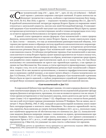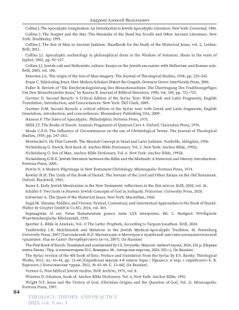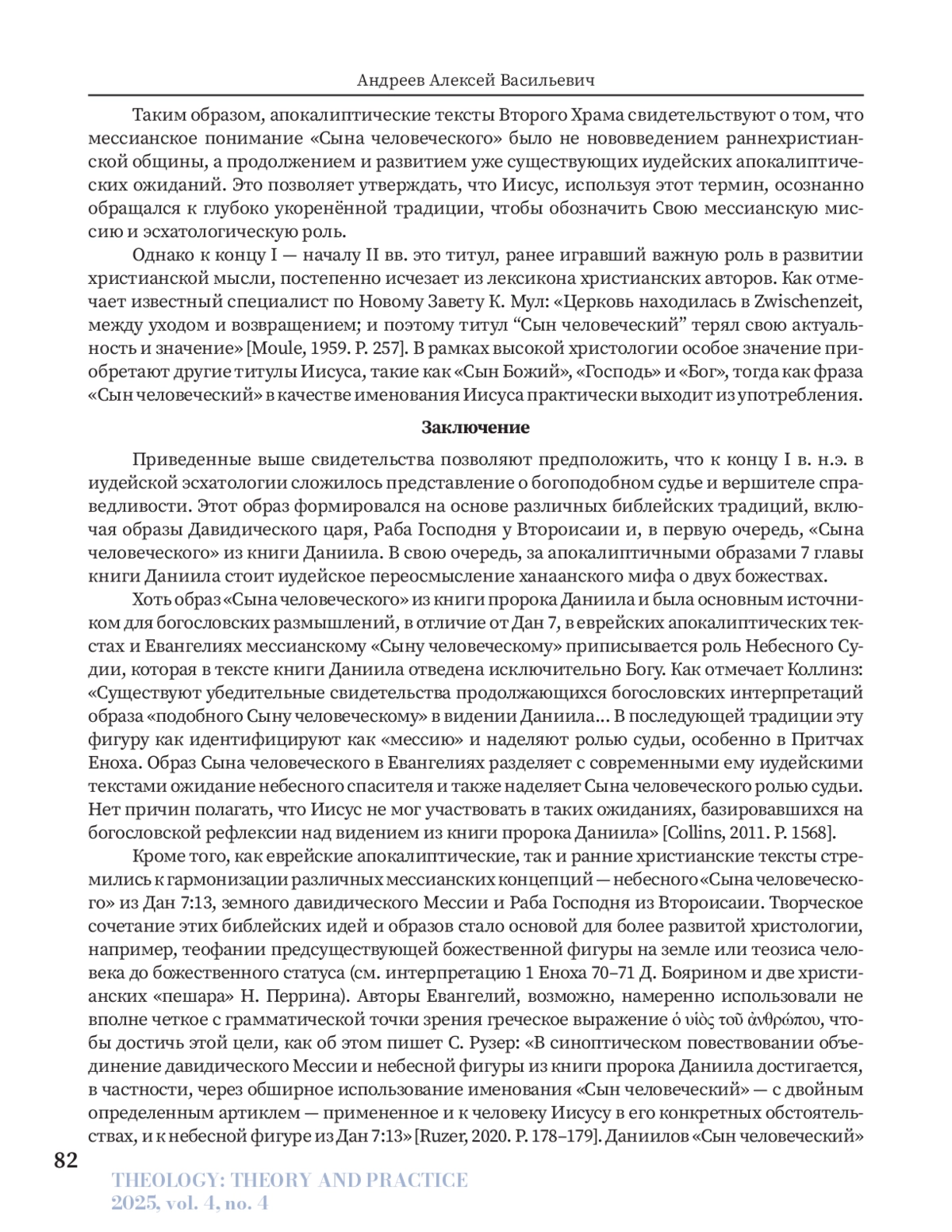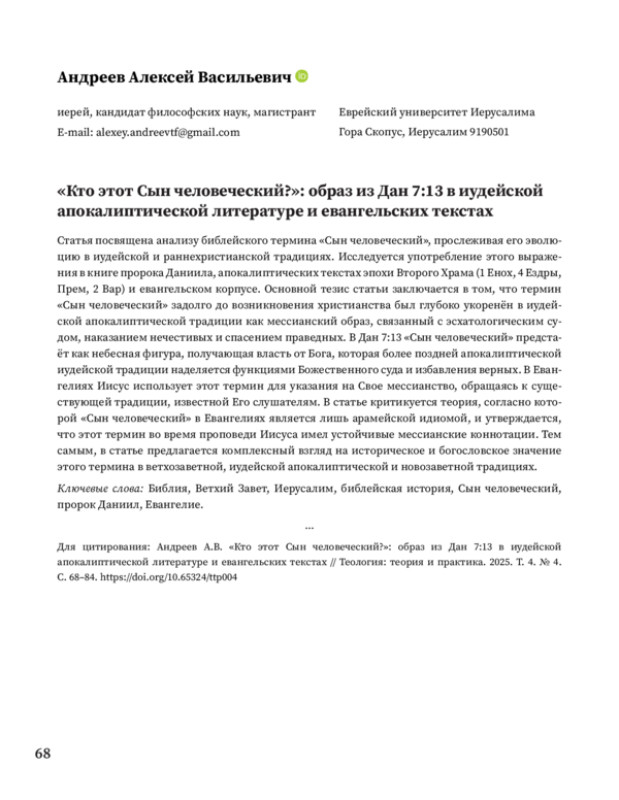 Статья посвящена анализу библейского термина «Сын человеческий», прослеживая его эволюцию в иудейской и раннехристианской традициях. Исследуется употребление этого выражения в книге пророка Даниила, апокалиптических текстах эпохи Второго Храма (1 Енох, 4 Ездры, Прем, 2 Вар) и евангельском корпусе. Основной тезис статьи заключается в том, что термин «Сын человеческий» задолго до возникновения христианства был глубоко укоренён в иудейской апокалиптической традиции как мессианский образ, связанный с эсхатологическим судом, наказанием нечестивых и спасением праведных. В Дан 7:13 «Сын человеческий» предста- ёт как небесная фигура, получающая власть от Бога, которая более поздней апокалиптической иудейской традиции наделяется функциями Божественного суда и избавления верных. В Евангелиях Иисус использует этот термин для указания на Свое мессианство, обращаясь к существующей традиции, известной Его слушателям. В статье критикуется теория, согласно которой «Сын человеческий» в Евангелиях является лишь арамейской идиомой, и утверждается, что этот термин во время проповеди Иисуса имел устойчивые мессианские коннотации. Тем самым, в статье предлагается комплексный взгляд на историческое и богословское значение этого термина в ветхозаветной, иудейской апокалиптической и новозаветной традициях.
