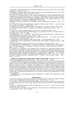 1. Дудко Г.Н. Казуальное толкование: к постановке вопроса о понятиях и видах / Г.Н. Дудко // Гуманитарные, социально-экономические и общественные науки. - 2022. - № 11-2. - С. 71-75. EDN: DRRUHL