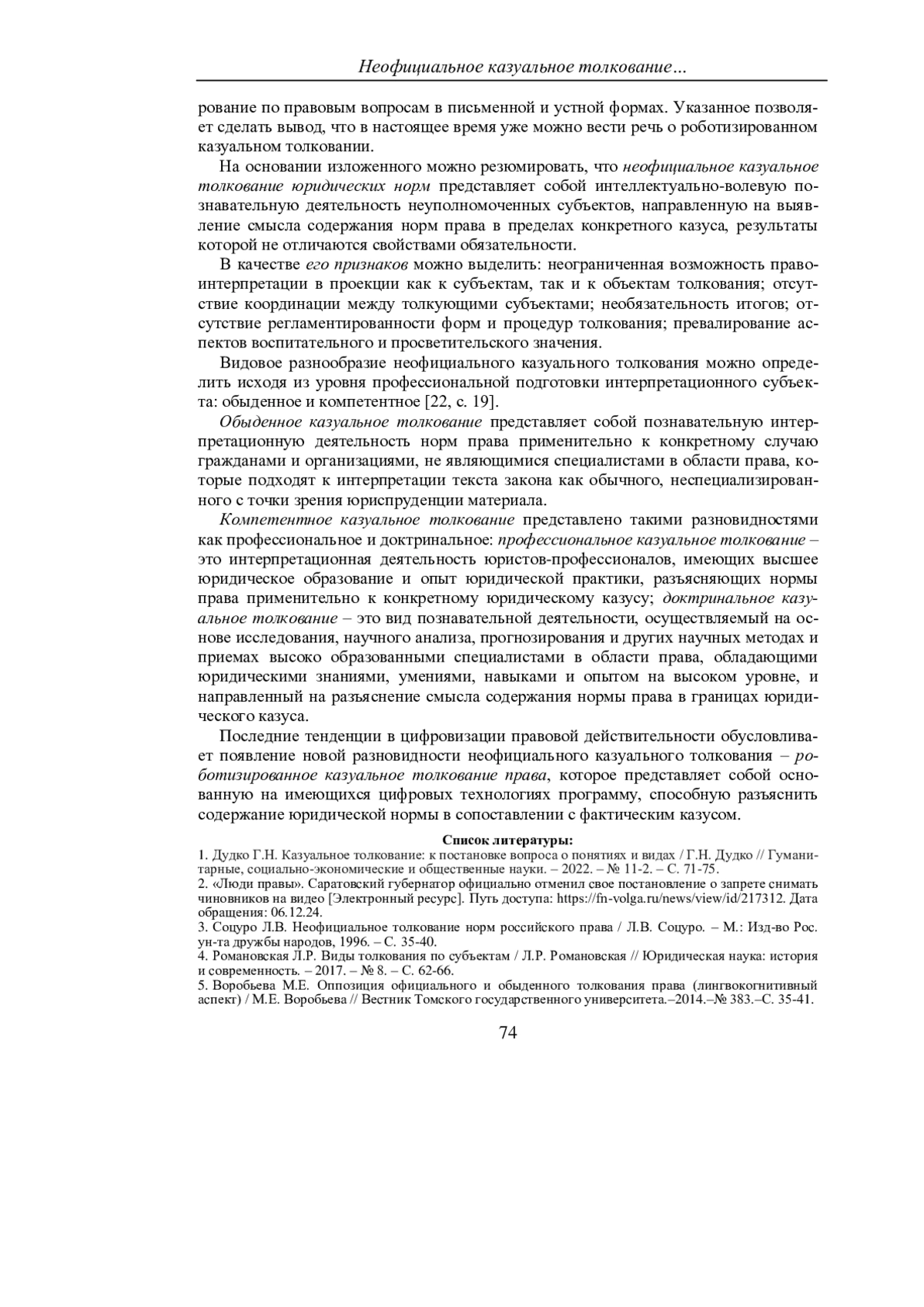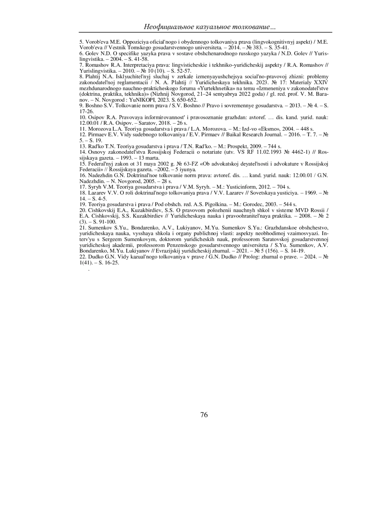 22. Дудко Г.Н. Виды казуального толкования в праве / Г.Н. Дудко // Пролог: журнал о праве. - 2024. -№ 1(41). - С. 16-25. EDN: EIKOSU