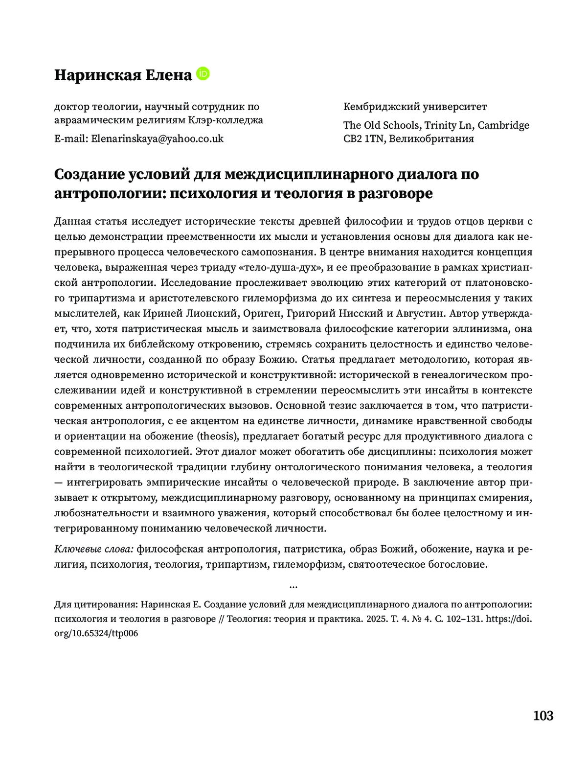 Данная статья исследует исторические тексты древней философии и трудов отцов церкви с целью демонстрации преемственности их мысли и установления основы для диалога как непрерывного процесса человеческого самопознания. В центре внимания находится концепция человека, выраженная через триаду «тело-душа-дух», и ее преобразование в рамках христианской антропологии. Исследование прослеживает эволюцию этих категорий от платоновского трипартизма и аристотелевского гилеморфизма до их синтеза и переосмысления у таких мыслителей, как Ириней Лионский, Ориген, Григорий Нисский и Августин. Автор утверждает, что, хотя патристическая мысль и заимствовала философские категории эллинизма, она подчинила их библейскому откровению, стремясь сохранить целостность и единство человеческой личности, созданной по образу Божию. Статья предлагает методологию, которая является одновременно исторической и конструктивной: исторической в генеалогическом прослеживании идей и конструктивной в стремлении переосмыслить эти инсайты в контексте современных антропологических вызовов. Основной тезис заключается в том, что патристическая антропология, с ее акцентом на единстве личности, динамике нравственной свободы и ориентации на обожение (theosis), предлагает богатый ресурс для продуктивного диалога с современной психологией. Этот диалог может обогатить обе дисциплины: психология может найти в теологической традиции глубину онтологического понимания человека, а теология — интегрировать эмпирические инсайты о человеческой природе. В заключение автор призывает к открытому, междисциплинарному разговору, основанному на принципах смирения, любознательности и взаимного уважения, который способствовал бы более целостному и интегрированному пониманию человеческой личности.