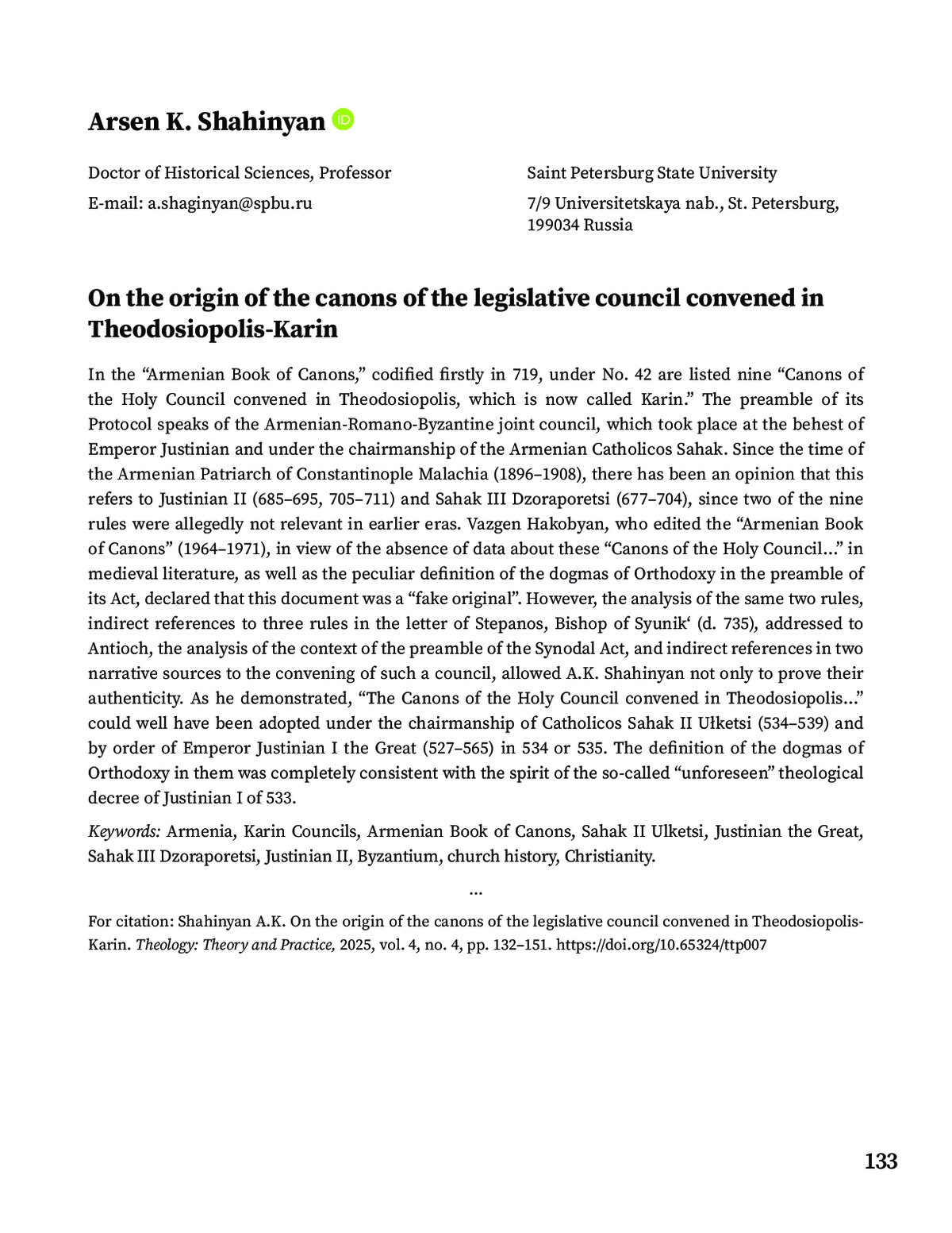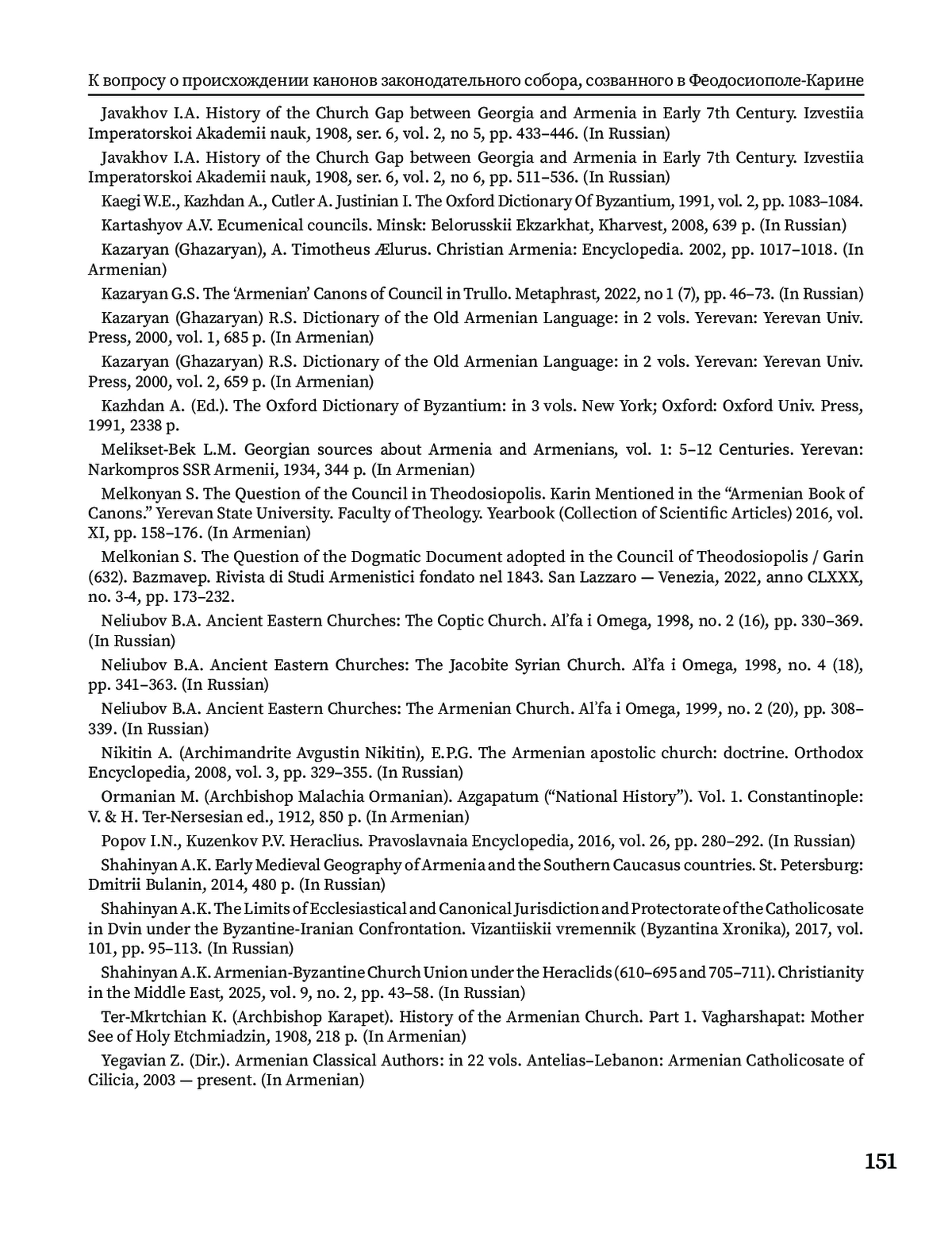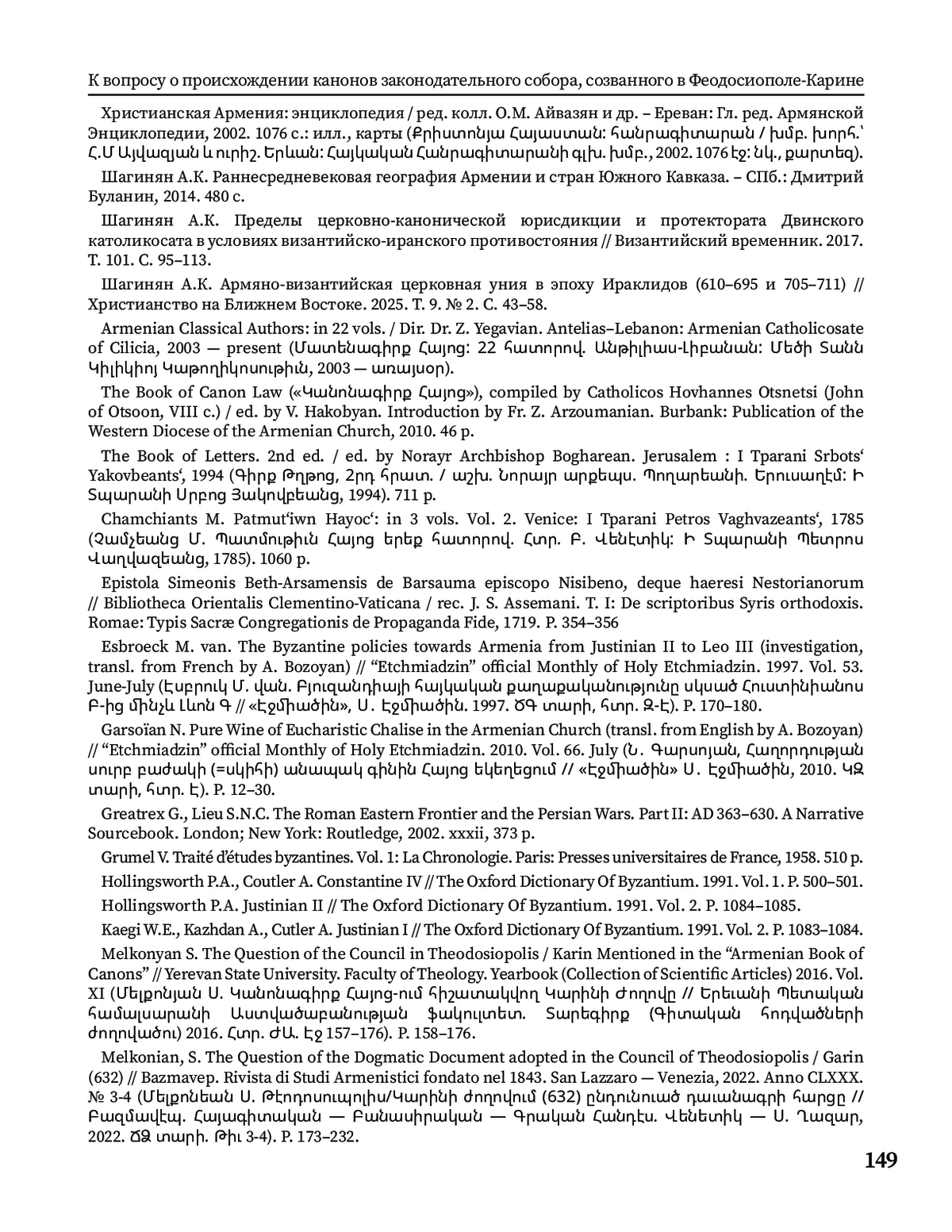 45. Melkonyan S. The Question of the Council in Theodosiopolis / Karin Mentioned in the “Armenian Book of Canons” // Yerevan State University. Faculty of Theology. Yearbook (Collection of Scientific Articles) 2016. Vol. XI (Մելքոնյան Ս. Կանոնագիրք Հայոց-ում հիշատակվող Կարինի Ժողովը // Երեւանի Պետական համալսարանի Աստվածաբանության ֆակուլտետ. Տարեգիրք (Գիտական հոդվածների ժողովածու) 2016. Հտր. ԺԱ. Էջ 157-176). P. 158-176.