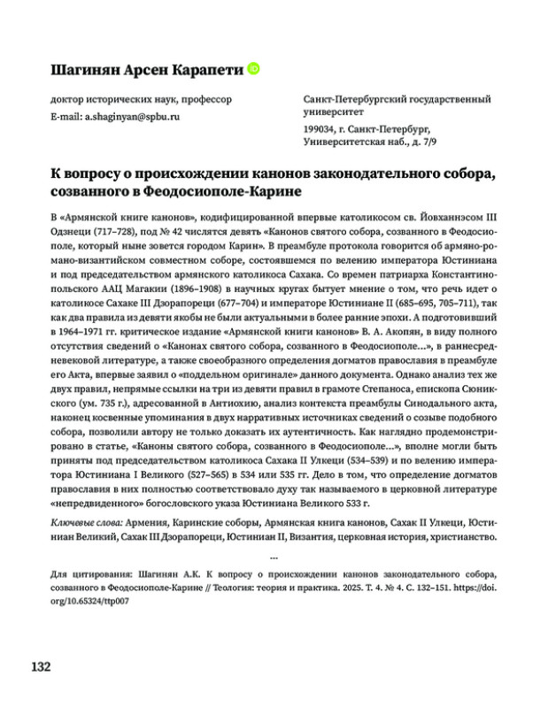 31. Шагинян А.К. Пределы церковно-канонической юрисдикции и протектората Двинского католикосата в условиях византийско-иранского противостояния // Византийский временник. 2017. Т. 101. С. 95-113.