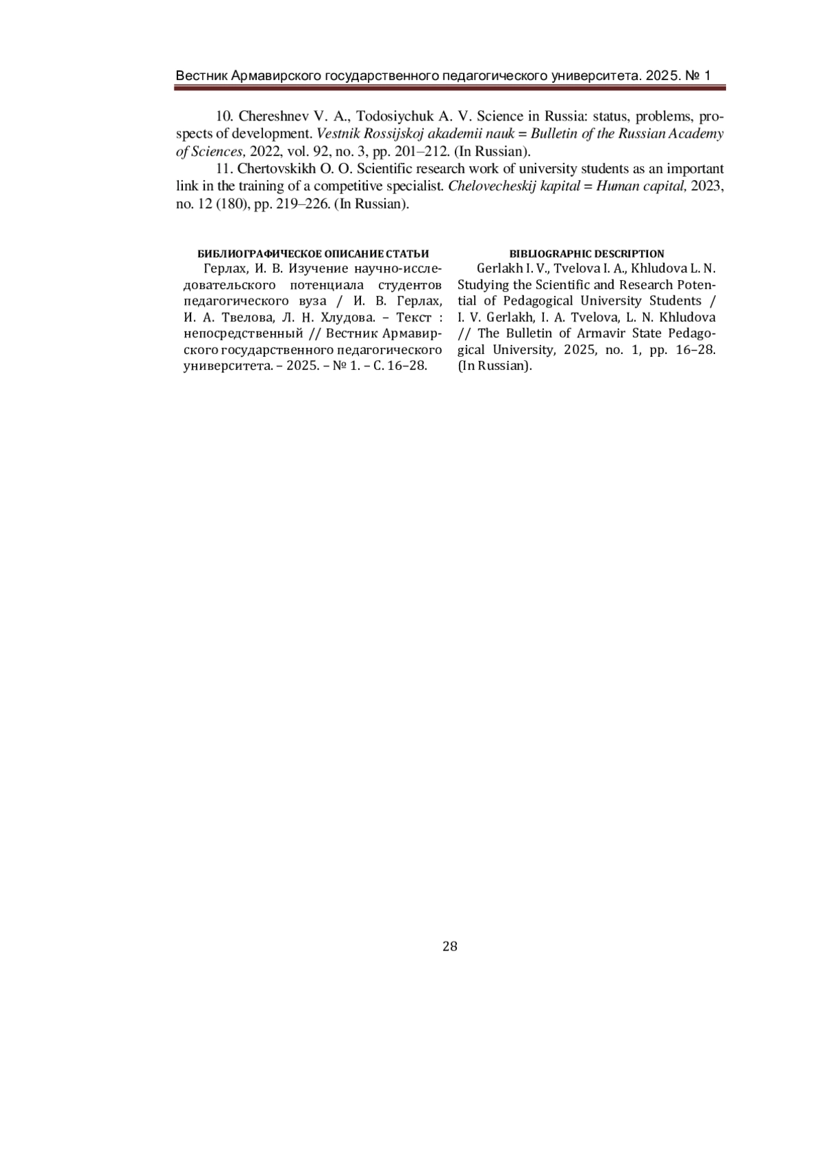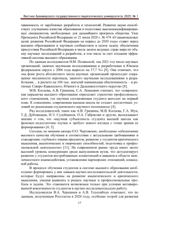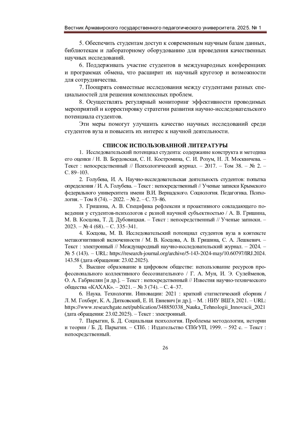 ГЕРЛАХ И. В., ТВЕЛОВА И. А., ХЛУДОВА Л. Н. ИЗУЧЕНИЕ НАУЧНО-ИССЛЕДОВАТЕЛЬСКОГО ПОТЕНЦИАЛА СТУДЕНТОВ ПЕДАГОГИЧЕСКОГО ВУЗА // ВЕСТНИК АРМАВИРСКОГО ГОСУДАРСТВЕННОГО ПЕДАГОГИЧЕСКОГО УНИВЕРСИТЕТА. 2025. № 1