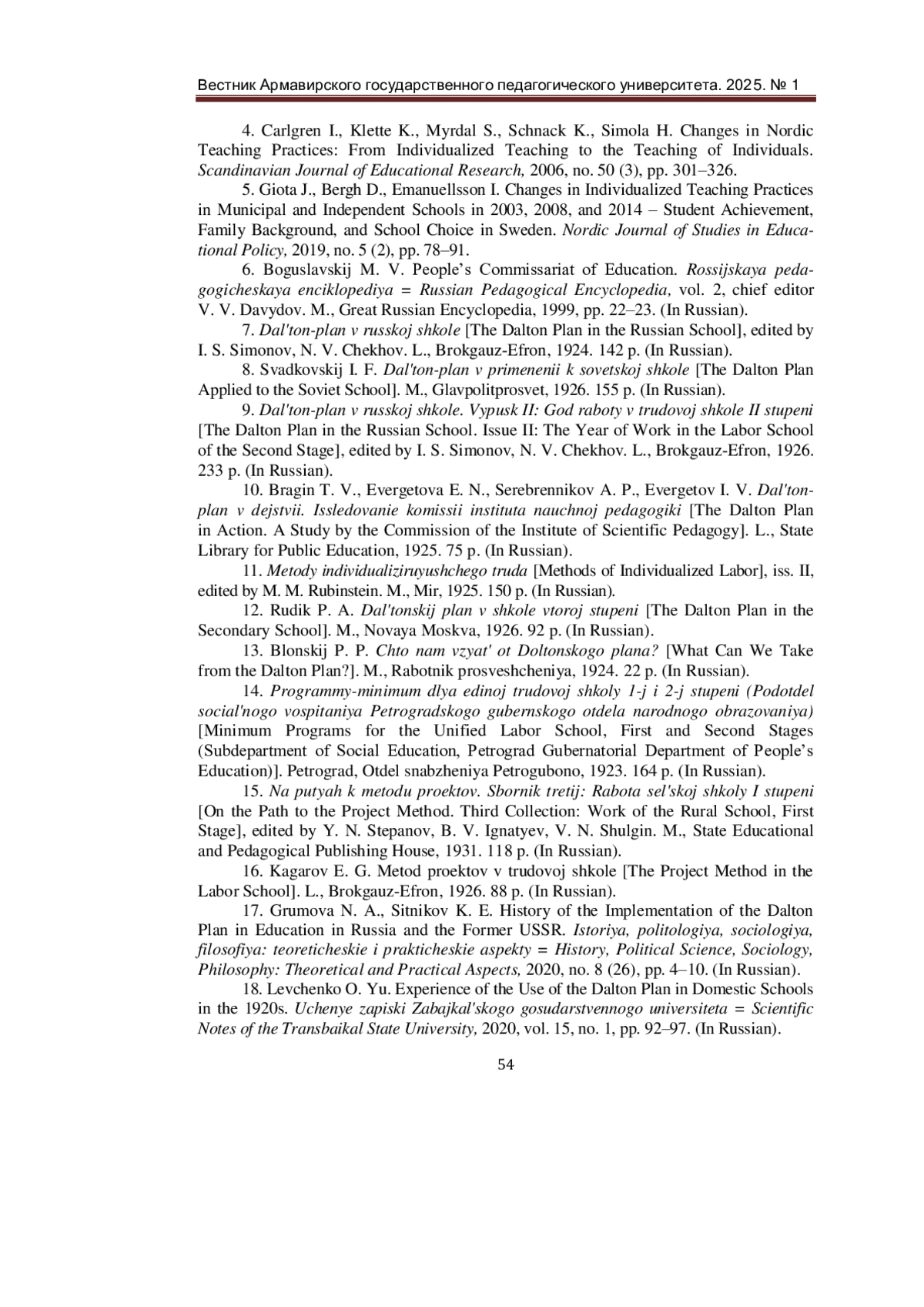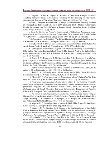 18. Левченко, О. Ю. Опыт использования Дальтон-плана в отечественной школе в 20-е годы XX века / О. Ю. Левченко. - Текст: непосредственный // Ученые записки Забайкальского государственного университета. - 2020. - Том 15. - № 1. - С. 92-97. EDN: KOWPTC