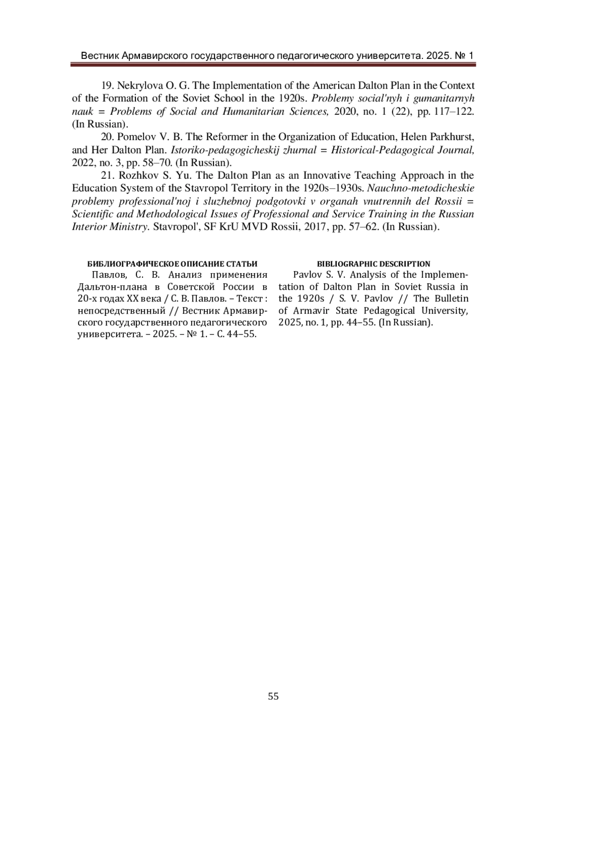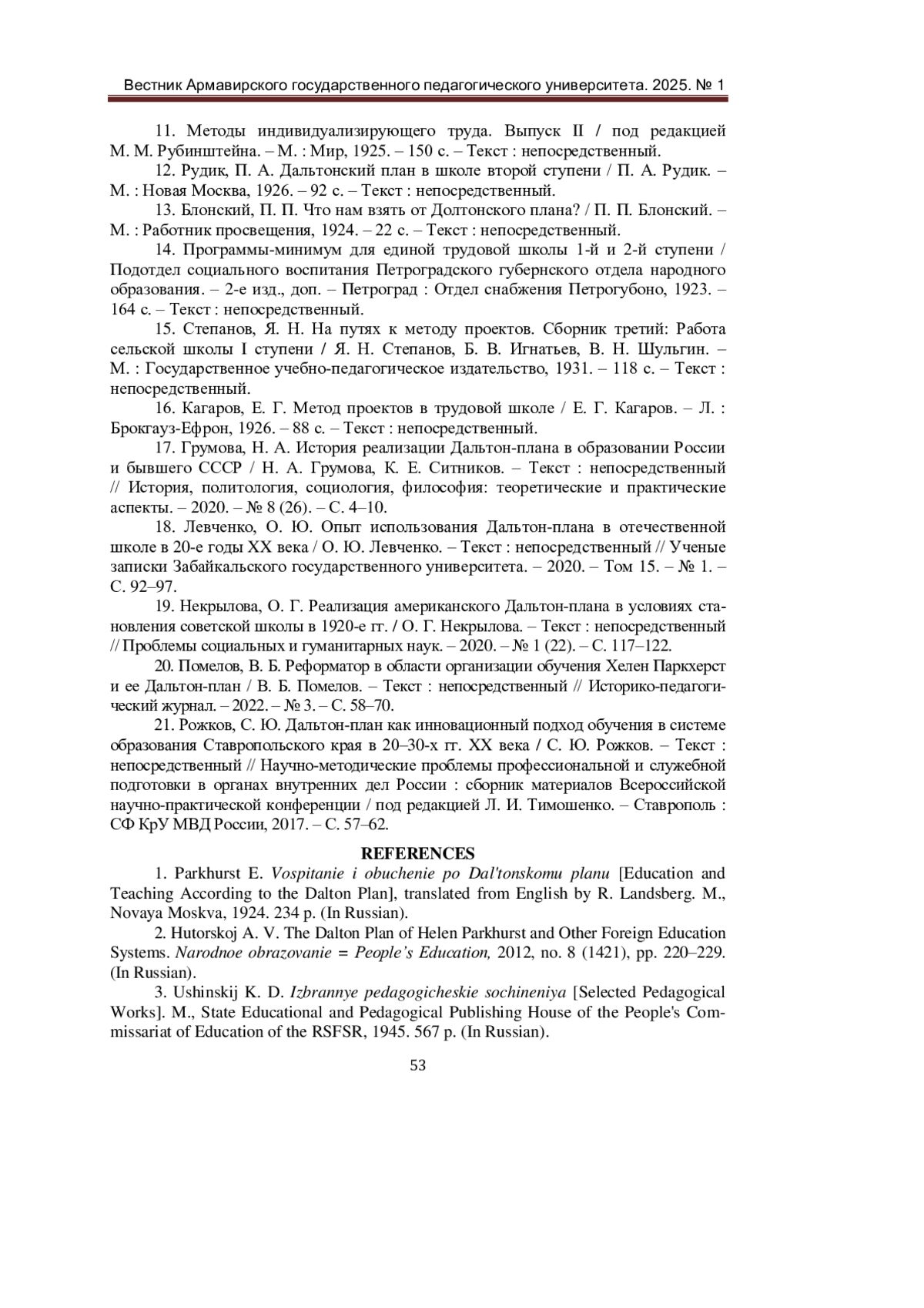 19. Некрылова, О. Г. Реализация американского Дальтон-плана в условиях становления советской школы в 1920-е гг. / О. Г. Некрылова. - Текст: непосредственный // Проблемы социальных и гуманитарных наук. - 2020. - № 1 (22). - С. 117-122. EDN: LHXJIV