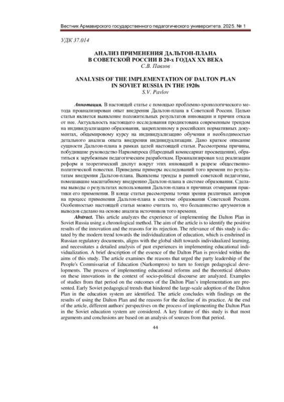 17. Грумова, Н. А. История реализации Дальтон-плана в образовании России и бывшего СССР / Н. А. Грумова, К. Е. Ситников. - Текст: непосредственный // История, политология, социология, философия: теоретические и практические аспекты. - 2020. - № 8 (26). - С. 4-10. EDN: KZHXGC