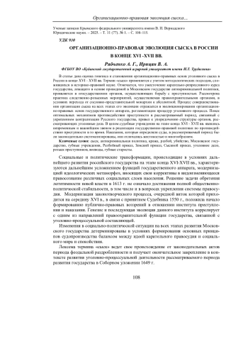 В статье дана оценка генезиса и становления организационно-правовых основ уголовного сыска в России в конце XVI - XVII вв. Термин «сыск» применяется с учетом методологических подходов, сложившихся в историко-правовой науке. Отмечается, что ужесточение карательно-репрессивного курса государства, лежащего в основе проводимой в Московском государстве антикриминальной политики, проявляется в огосударствлении органов, осуществляющих борьбу с преступностью. Рассмотрена практика следственно-розыскных мероприятий, осуществляемая правоохранительными органами, в условиях перехода от сословно-представительной монархии к абсолютной. Процесс совершенствования организации сыска на всех этапах его эволюции отражается в эволюционировании организационно-правовых основ государственного аппарата, регламентации процедур уголовного процесса. Поиск оптимальных механизмов противодействия преступности в рассматриваемый период, связанный с укреплением централизации Русского государства, привел к упорядочению структуры органов, рассматривающих уголовные дела. В целом судебные учреждения на этапе конца XVI - XVII вв. являлись непременным и важнейшим звеном в реализации государственно-правовой политики по противодействию преступности в то время. Наказания, которые определяли суды, в рассматриваемый период были законодательно систематизированы, они отличались жестокостью и многообразием.