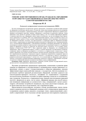 В статье анализируются исторические аспекты зарождения, становления и развития права граждан на обращения в публичные органы власти. В качестве этапов, выступающих предметом исследования, предлагается рассматривать: дореволюционный, советский и современный. Проводится сравнительно-правовое исследование трактовок термина «обращение» в различные исторические периоды. Автор принимает точку зрения тех авторов, которые делают вывод о том, что основы современного правового явления известного как «обращения» имеют корни в челобитных, так как они впервые были юридически закреплены в Судебнике 1497 года (дореволюционный период), однако челобитные имели суть прошения. Анализ данного и более поздних нормативных правовых актов, связанных с регламентацией обращений позволяют отследить, как представления о содержании права на обращения расширялись в связи с закреплением на нормативном уровне возможности обращаться как с индивидуальными, так и с коллективными обращениями, с обособлением анонимных, повторных прошений и др. Автором анализируется уровень развития теоретической и юридической составляющей сущности и содержания права на обращение в каждом из периодов. В советский период отмечается, что на уровне закона, впервые в Конституции СССР 1977 г. было закреплено право на обращение, но в специфическом оформлении. Лишь в современный период, в связи со сменой парадигмы государственного развития, содержание права на обращение расширяется и уточняется в содержательных, сущностных и процедурных параметрах. На основе изучения большого массива научной литературы делается вывод о том, что современная регламентация, социальная сущность, формально-юридическое содержание права на обращение есть итог развития взаимоотношений личности с государством в области становления и развития политических прав граждан. С учетом того, что в основе права на обращения лежит право на свободу к получению и распространению информации, включая ее передачу, современный этап развития института обращений граждан подчиняется всеобщему тренду оцифровывания.