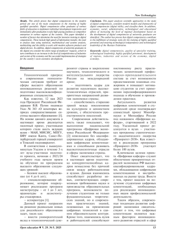 Ключевые фразы: цифровые компетенции, качество подготовки специалистов, технологическое лидерство, высококвалифициро- ванные кадры, развитие регионов, отраслей и сфер экономики, цифровая экономика