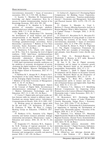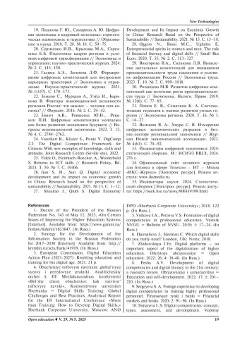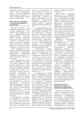 Заключение. В настоящей работе проведен анализ научных подходов к исследованию цифровых компетенций, рассмотрены современные модели и фреймворки цифровых компетенций (digital skills), проведена их классификация. Кроме того, выявлены экономические, социальные, административные, технологические т образовательные эффекты повышения уровня развития регионов на основе развития цифровых компетенций выпускников вузов. Автором доказано, что цифровые компетенции способствуют выполнению стратегических задач по подготовке высококвалифицированных кадров и обеспечению технологической независимости и технологического лидерства Российской Федерации.