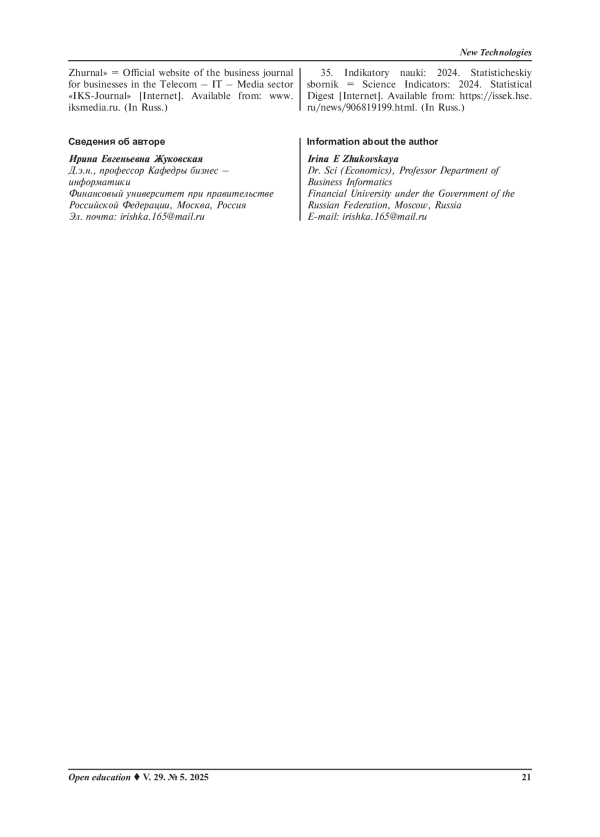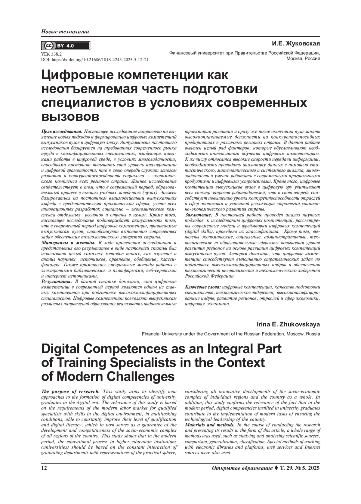 ЖУКОВСКАЯ И. Е. ЦИФРОВЫЕ КОМПЕТЕНЦИИ КАК НЕОТЪЕМЛЕМАЯ ЧАСТЬ ПОДГОТОВКИ СПЕЦИАЛИСТОВ В УСЛОВИЯХ СОВРЕМЕННЫХ ВЫЗОВОВ // ОТКРЫТОЕ ОБРАЗОВАНИЕ. 2025. ТОМ 29, № 5