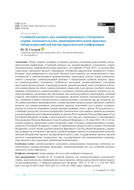 Обзор содержит основные положения докладов участников всероссийской научно-практической конференции «Судебный контроль над административным усмотрением: теория, законодательство, правоприменительная практика», состоявшейся 30 мая 2025 г. в частном образовательном учреждении высшего образования «Сибирский юридический университет» (Омск). В рамках темы конференции ее участники обсудили такие вопросы, как дискреционность в нормотворчестве и административном правоприменении, прикладные аспекты теории административного усмотрения, административный произвол и материальный судебный контроль, пределы административного усмотрения, особенности реализации административного усмотрения при издании процессуальных и внепроцессуальных административных актов, усмотрение публичной администрации как объект административного правосудия и как предмет судебного контроля, правовая подчиненность административного усмотрения судебной юрисдикции, контроль над административным усмотрением при применении мер административного принуждения, судебный контроль обоснования контрольными (надзорными) органами наличия «непосредственной угрозы», основания судебного вмешательства в административное усмотрение при рассмотрении дел об административных правонарушениях, административно-процессуальные принципы судебного контроля над административным усмотрением, пределы полномочий суда в рамках судопроизводства по делам об оспаривании административно-правовых актов и другие. По результатам состоявшейся дискуссии участники конференции единогласным голосованием приняли резолюцию, в которой признали целесообразной разработку проекта Постановления Пленума Верховного Суда Российской Федерации (в форме самостоятельного акта или акта, изменяющего и дополняющего Постановление Пленума Верховного Суда Российской Федерации от 28 июня 2022 г. № 21 «О некоторых вопросах применения судами положений главы 22 Кодекса административного судопроизводства Российской Федерации и главы 24 Арбитражного процессуального кодекса Российской Федерации») и (или) обзора судебной практики Верховного Суда Российской Федерации, содержащих развернутые положения о критериях судебной проверки законности дискреционных решений, действий (бездействия) органов государственной власти, иных государственных органов, органов местного самоуправления, должностных лиц, государственных или муниципальных служащих, иных органов и лиц, наделенных публичными полномочиями.