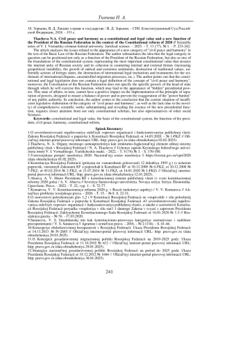 В статье анализируются вопросы, связанные с появлением в тексте Основного закона Российской Федерации новой категории «гражданский мир и согласие». Автором обосновывается идея о том, что рассматриваемая правовая категория может позиционироваться не только как функция Президента Российской Федерации, но и как одна из основ конституционного строя, представляющая собой важнейшую конституционную ценность, обеспечивающую внутреннее единство российского общества и его сплоченность в деле противостояния внутренним и внешним угрозам (усиливающаяся геополитическая нестабильность, рост радикальных и экстремистских настроений, разрушение традиционных ценностей, недружественные действия иностранных государств, разрушение международных правовых институтов и инструментов урегулирования международных споров, неконтролируемые миграционные процессы и т. д.). Автор указывает, что конституционно-правовое законодательство не содержит легальной дефиниции понятия «гражданский мир и согласие», более того в Конституции Российской Федерации отсутствует указание на конкретные полномочия главы государства, через посредство которых он будет реализовывать данную функцию, что может привести к появлению «скрытых» президентских полномочий. Такое положение вещей, в свою очередь, не может позитивно влиять на реализацию принципа разделения властей, призванного обеспечивать баланс властных полномочий и не допускать гипертрофированность «властной нагрузки» ни одного органа публичной власти. В заключении, автор приходит к выводу о том, что сложившаяся ситуация недостаточной законодательной проработки категории «гражданский мир и согласие», а также отсутствие (в виду новизны) комплексных научных работ, обосновывающих и раскрывающих сущность новой президентской функции, требует более пристального внимания со стороны не только ученых-конституционалистов, но и представителей иных общественных наук.