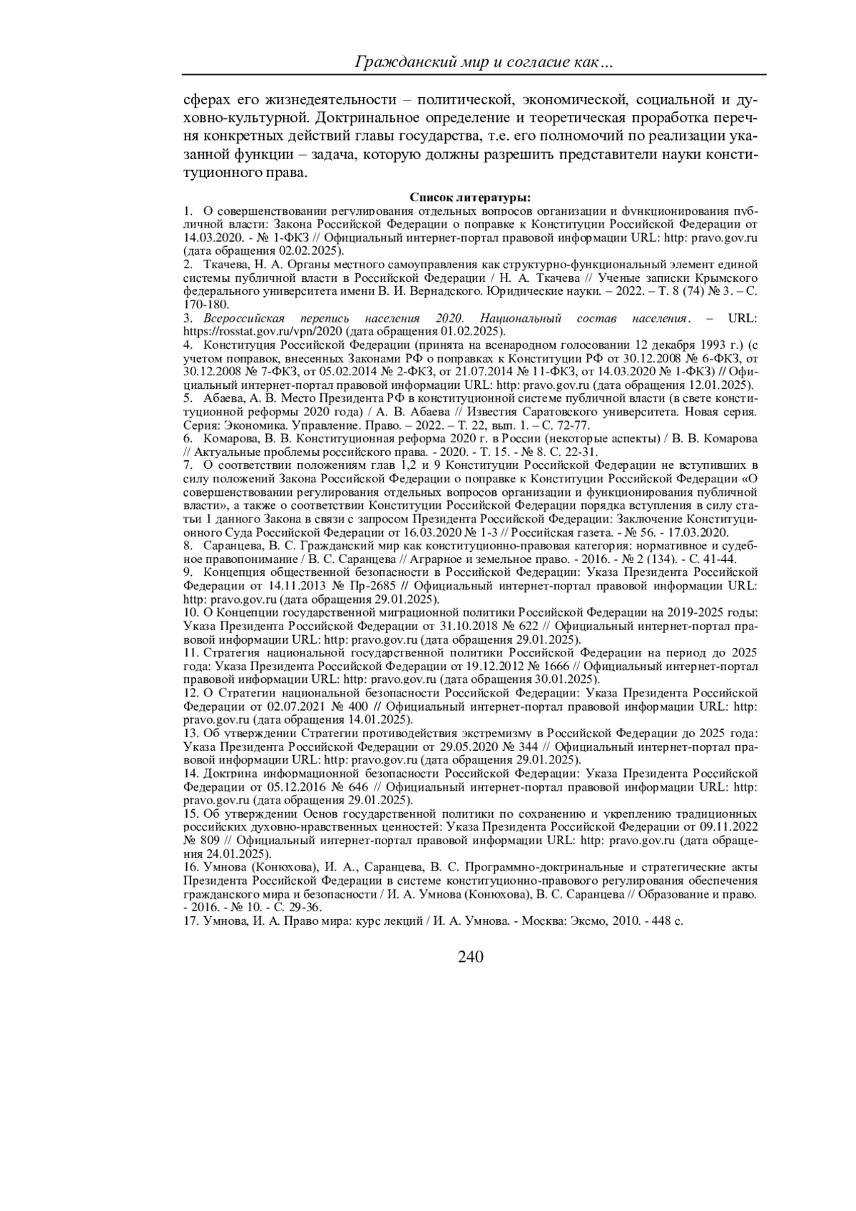 16. Умнова (Конюхова), И. А., Саранцева, В. С. Программно-доктринальные и стратегические акты Президента Российской Федерации в системе конституционно-правового регулирования обеспечения гражданского мира и безопасности / И. А. Умнова (Конюхова), В. С. Саранцева // Образование и право. - 2016. - № 10. - С. 29-36. EDN: XCNRHH