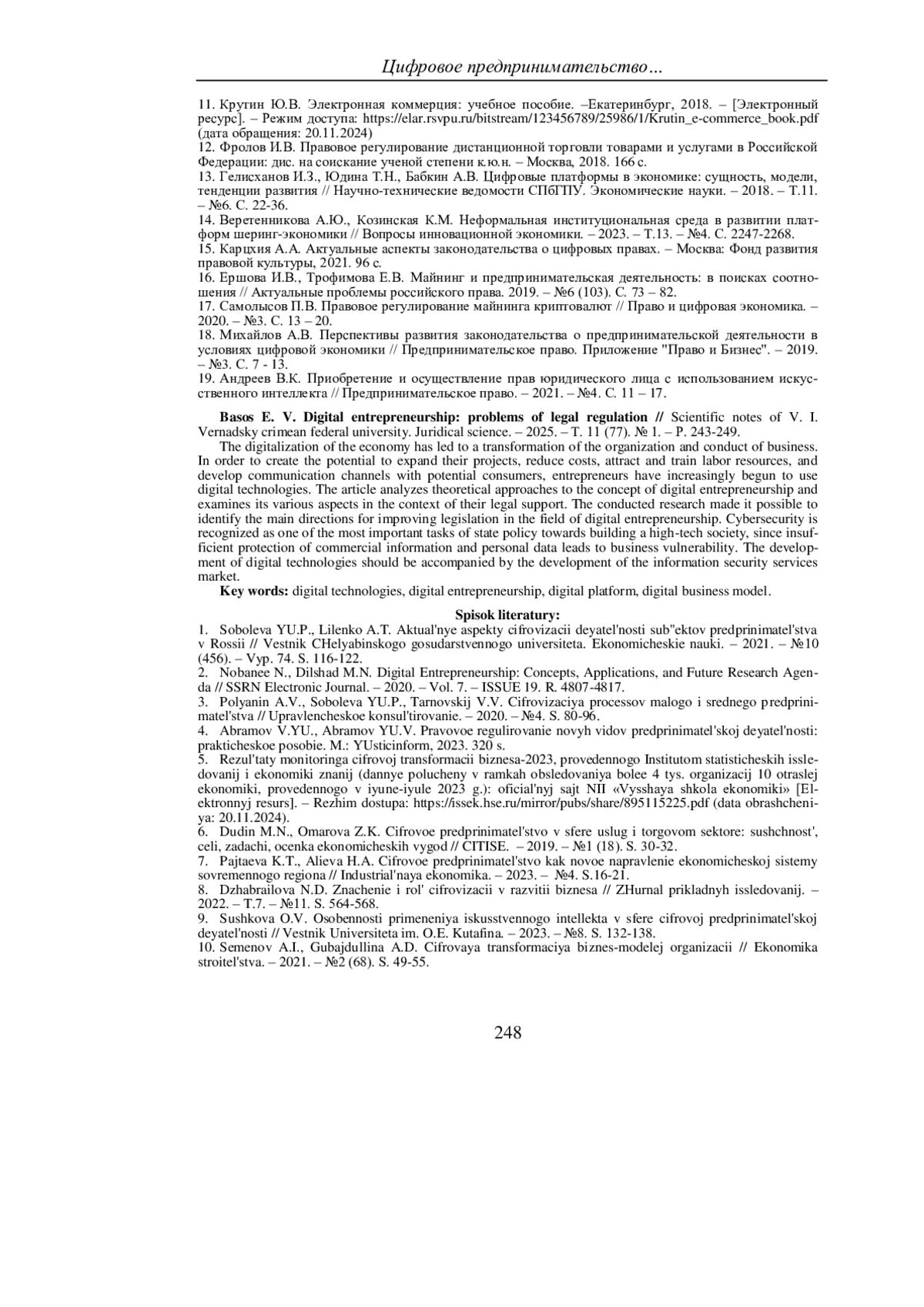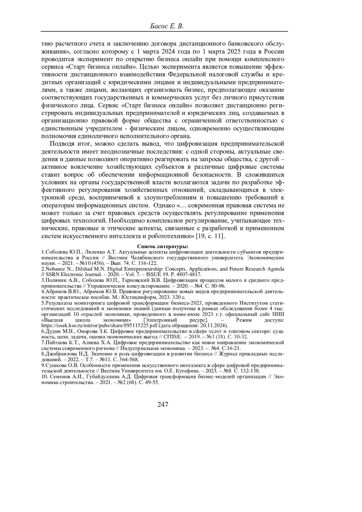 1. Соболева Ю.П., Лиленко А.Т. Актуальные аспекты цифровизации деятельности субъектов предпринимательства в России // Вестник Челябинского государственного университета. Экономические науки. - 2021. - №10 (456). - Вып. 74. С. 116-122.