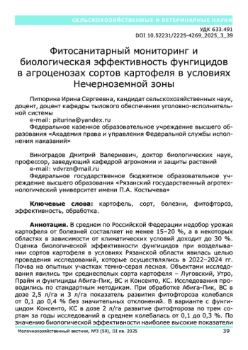 Статья: Фитосанитарный мониторинг и биологическая эффективность фунгицидов в агроценозах сортов картофеля в условиях Нечерноземной зоны (2025)