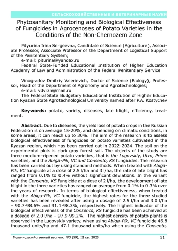 В среднем по Российской Федерации недобор урожая картофеля от болезней составляет не менее 15–20 %, а в некоторых областях в зависимости от климатических условий доходит до 30 %. Оценка биологической эффективности фунгицидов при возделывании сортов картофеля в условиях Рязанской области явилась целью проведения исследований, которые осуществлялись в 2022–2024 гг. Почва на опытных участках темно-серая лесная. Объектами исследования явились три среднеспелых сорта картофеля – Луговский, Утро, Прайм и фунгициды Абига-Пик, ВС и Консенто, КС. Исследования проводились по стандартным методикам. При обработке Абига-Пик, ВС в дозе 2,5 л/га и 3 л/га показатель развития фитофтороза колебался от 0,1 до 0,4 % без значительных отклонений. В варианте с фунгицидом Консенто, КС в дозе 2 л/га развитие фитофтороза по трем сортам за годы исследований в среднем колебалась от 0,1 до 0,3 %. По значению биологической эффективности наиболее высокие показатели по трем исследуемым сортам при обработке фунгицидом Абига-Пик, ВС показала дозировка 2,5 л/га и 3,0 л/га – 90,7–98,6 % и 91,1–98,3 % соответственно. Самый высокий показатель биологической эффективности фунгицида Консенто, КС был достигнут при дозировке 2,0 л/га – 97,9–99,2 %. Наибольшая густота стояния растений картофеля наблюдается у сорта Луговский с применением фунгицида АбигаПик, ВС 46,8 тыс. шт./га и 47,1 тыс. шт./га с применением фунгицида Консенто, КС, что выше контрольного варианта на 21,2 и 21,3 % соответственно. Количество клубней у картофеля сорта Луговский в вариантах опыта с применением фунгицида Абига-Пик, ВС составило 8,7 шт., при применении фунгицида Консенто, КС – 9,1, а на контроле 7,5. На вариантах с применением фунгицидов установлена достоверная прибавка урожая клубней картофеля сорта Луговский с применением фунгицида Абига-Пик, ВС с нормой 2,5 л/га плюс 85,4 ц/га, или 41,9 % к контролю. На варианте с применением Консенто, КС прибавка урожая сорта Луговский относительно контроля составила 66,7 ц/га, или 32,7 %.
