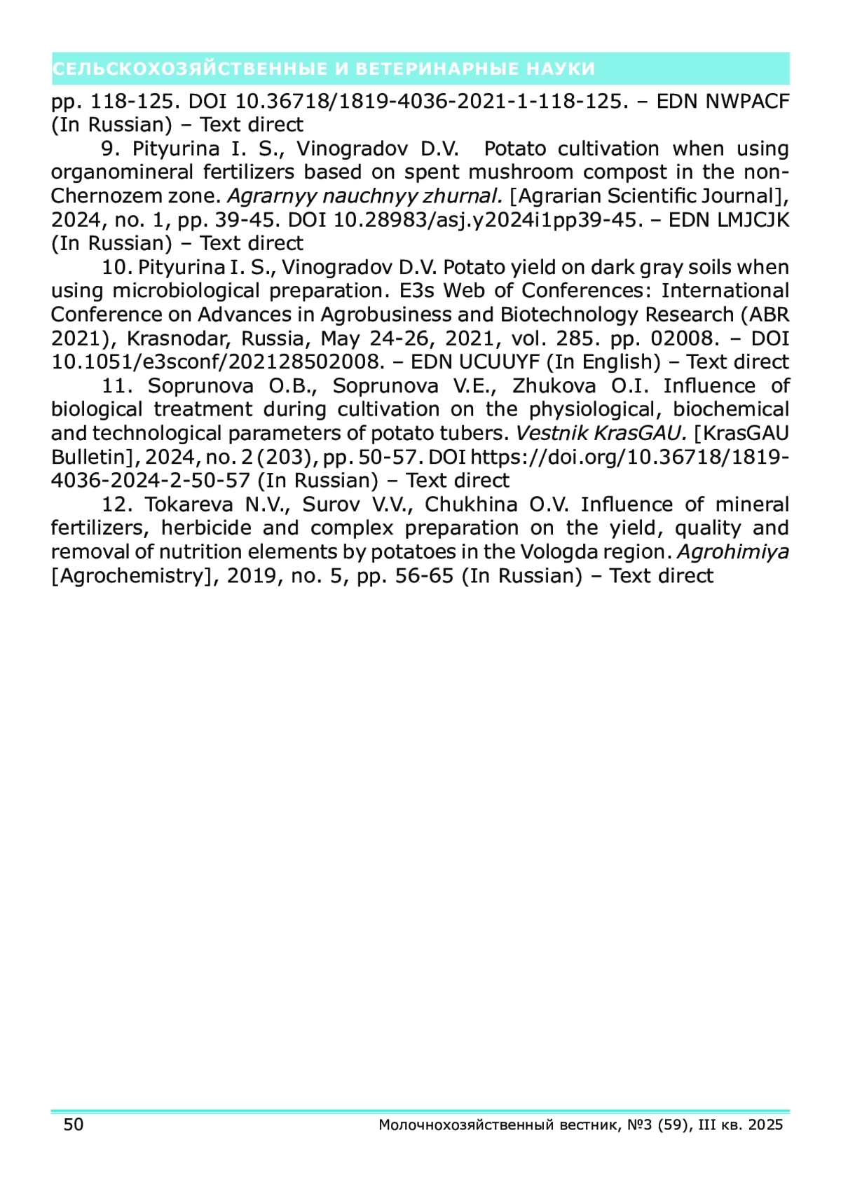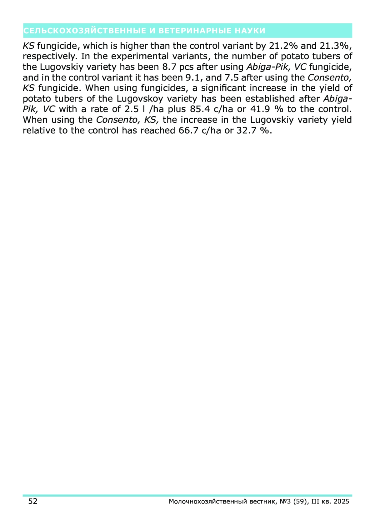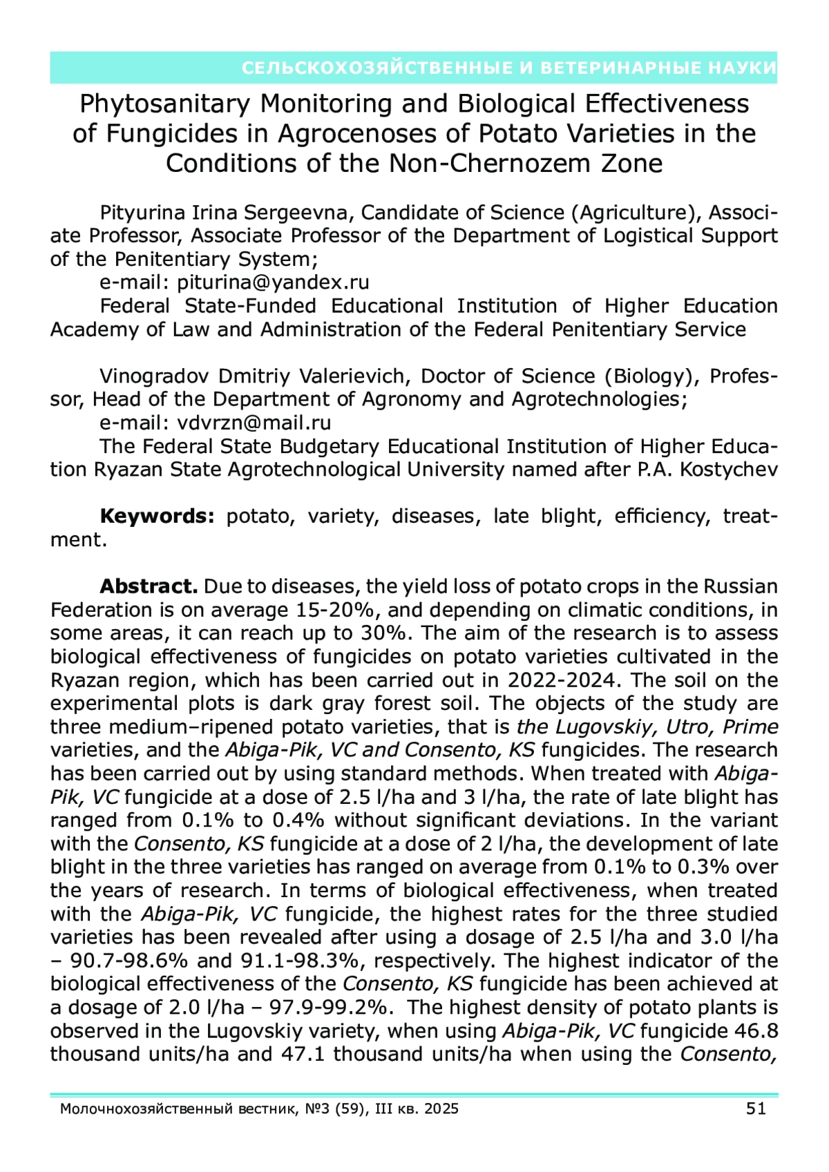 ПИТЮРИНА И. С., ВИНОГРАДОВ Д. В. ФИТОСАНИТАРНЫЙ МОНИТОРИНГ И БИОЛОГИЧЕСКАЯ ЭФФЕКТИВНОСТЬ ФУНГИЦИДОВ В АГРОЦЕНОЗАХ СОРТОВ КАРТОФЕЛЯ В УСЛОВИЯХ НЕЧЕРНОЗЕМНОЙ ЗОНЫ // МОЛОЧНОХОЗЯЙСТВЕННЫЙ ВЕСТНИК. 2025. № 3 (59)