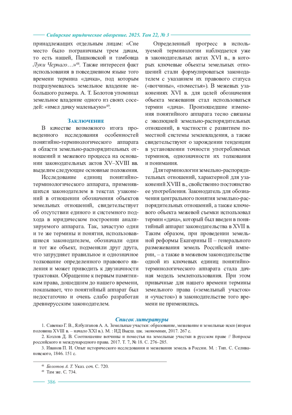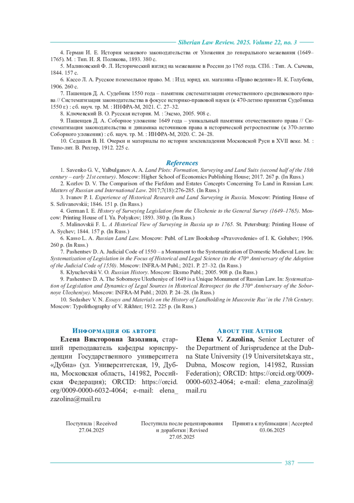 1. Савенко Г. В., Ялбулганов А. А. Земельные участки: образование, межевание и земельные иски (вторая половина XVIII в. - начало XXI в.). М. : ИД Высш. шк. экономики, 2017. 267 с.