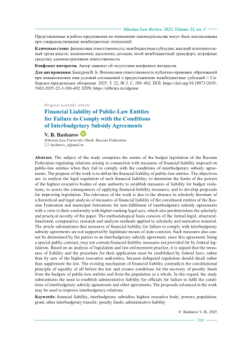 Предметом исследования являются нормы бюджетного законодательства Российской Федерации, регулирующие отношения, возникающие при применении мер финансовой ответственности публично-правовых образований при невыполнении ими условий соглашений о предоставлении межбюджетных субсидий. Цель работы заключается в определении финансовой ответственности публично-правовых образований. Задачи исследования: провести анализ правового регулирования финансовой ответственности публично-правовых образований, определить пределы полномочий высших исполнительных органов власти по установлению мер ответственности за совершение бюджетных нарушений, оценить последствия применения мер финансовой ответственности и выработать предложения по совершенствованию законодательства. Актуальность работы связана с тем, что в научной литературе до настоящего времени не представлен теоретико-правовой анализ мер финансовой ответственности субъектов Российской Федерации и муниципальных образований при невыполнении ими условий соглашений о предоставлении межбюджетных субсидий на предмет их соответствия актам вышестоящей юридической силы, что в том числе предопределяет научную и практическую новизну работы. Методологической основой исследования служит совокупность следующих научных методов: формально-юридического, структурно-функционального, сравнения, поиска и анализа научного и нормативного материала. По результатам проведенного исследования в статье обосновывается, что меры финансовой ответственности при невыполнении условий соглашений о предоставлении межбюджетных субсидий не обеспечены легитимными средствами государственного принуждения. Не могут эти меры определяться и сторонами соглашения о предоставлении межбюджетных субсидий, так как данное соглашение, являясь особым публичным договором, не может содержать меры финансовой ответственности, не предусмотренные федеральным законодательством. В статье на основании анализа законодательства и правоприменительной практики аргументируется, что меры ответственности, порядок их применения должны устанавливаться федеральными законами, а не актами высших исполнительных органов власти, так как подзаконное регулирование должно детализировать, не восполнять закон. Существующий механизм финансовой ответственности противоречит конституционному принципу равенства всех перед законом, создает условия для взыскания штрафных средств с бюджетов публично-правовых образований и населения в целом. В связи с этим в исследовании обосновывается необходимость установления административной ответственности должностных лиц за невыполнение ими условий соглашения о предоставлении межбюджетных субсидий, а также иных соглашений.