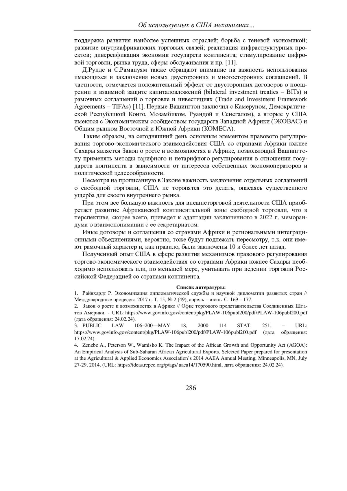 9. Kategekwa J. Recalibrating U.S. Economic Engagement with Africa in Light of the Implementation of the AfCFTA and the Final Days of the Current AGOA Authorization // The Brown Capital Management Africa Forum. Paper No. 11 - URL: https://agoa.info/images/documents/16186/kategekwa-recalibrating-useconomic-engagement-with-africa-in-light-of-the-implementation-of-the-afcfta-and-the-final-days-of-the-current-agoa-authorization.pdf (дата обращения: 03.03.2024).