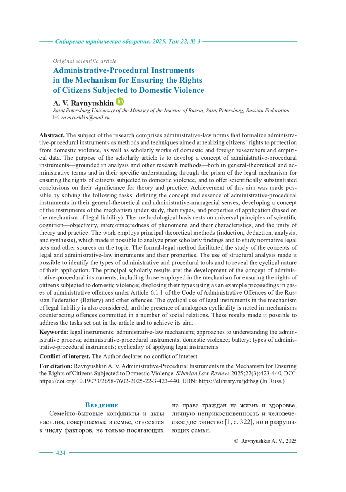 Предметом исследования являются административно-правовые нормы, формализующие административно-процессуальные средства как методы и прием воздействия, направленные на реализацию прав граждан на защиту от семейного насилия, а также научные труды отечественных и зарубежных ученых и эмпирические данные. Целью научной статьи является разработка концепции административно-процессуальных средств, основанная на анализе и других методах исследования, как в общетеоретическом и административном плане, так и в их специальном понимании через призму правового механизма обеспечения прав граждан, подвергшихся семейному насилию, и предложение научно обоснованных выводов об их значении для теории и практики. Достижение сформулированной цели стало возможным благодаря решению следующих задач: определение понятия и сущности административно-процессуальных средств в общетеоретическом и административно-распорядительном значении; разработка концепции административно-процессуальных средств исследуемого механизма, их видов и свойств применения (на основании механизма юридической ответственности). Методологическая основа базируется на универсальных принципах научного познания: объективности, взаимосвязи явлений и их характеристик, единстве теории и практики. В работе использованы основные теоретические методы (индукция, дедукция, анализ и синтез), которые позволили проанализировать результаты предыдущих научных исследований, изучить нормативно-правовые акты и другие источники по рассматриваемой теме. Формально-юридический метод способствовал изучению понятий юридических и административно-правовых средств и их свойств. Использование метода структурного анализа позволило выявить типы административных и процедурных инструментов, выявить циклический характер их применения. Основными научными результатами работы являются разработка понятия административно-процессуальных средств, в том числе применяемых в механизме обеспечения прав граждан, подвергшихся семейному насилию, раскрытие их видов на примере судопроизводства в делах об административных правонарушениях, предусмотренных статьей 6.1.1 Кодекса Российской Федерации об административных правонарушениях, и других правонарушениях. Также рассматривается цикличность использования правовых средств в механизме юридической ответственности и отмечается наличие аналогичной цикличности в механизмах противодействия правонарушениям, совершаемым в ряде общественных отношений. Указанные результаты позволили решить обозначенные в статье задачи и достичь поставленной цели.