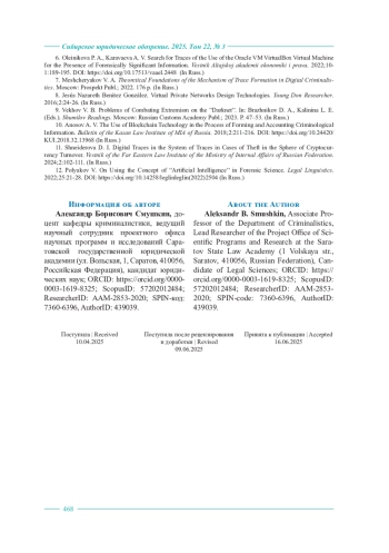 11. Шнейдерова Д. И. Цифровые следы в системе следов по делам о хищениях в сфере оборота криптовалют // Вестник Дальневосточного юридического института МВД России. 2024. № 2 (67). С. 102-111.