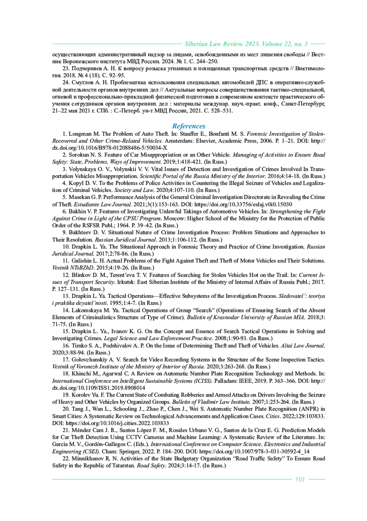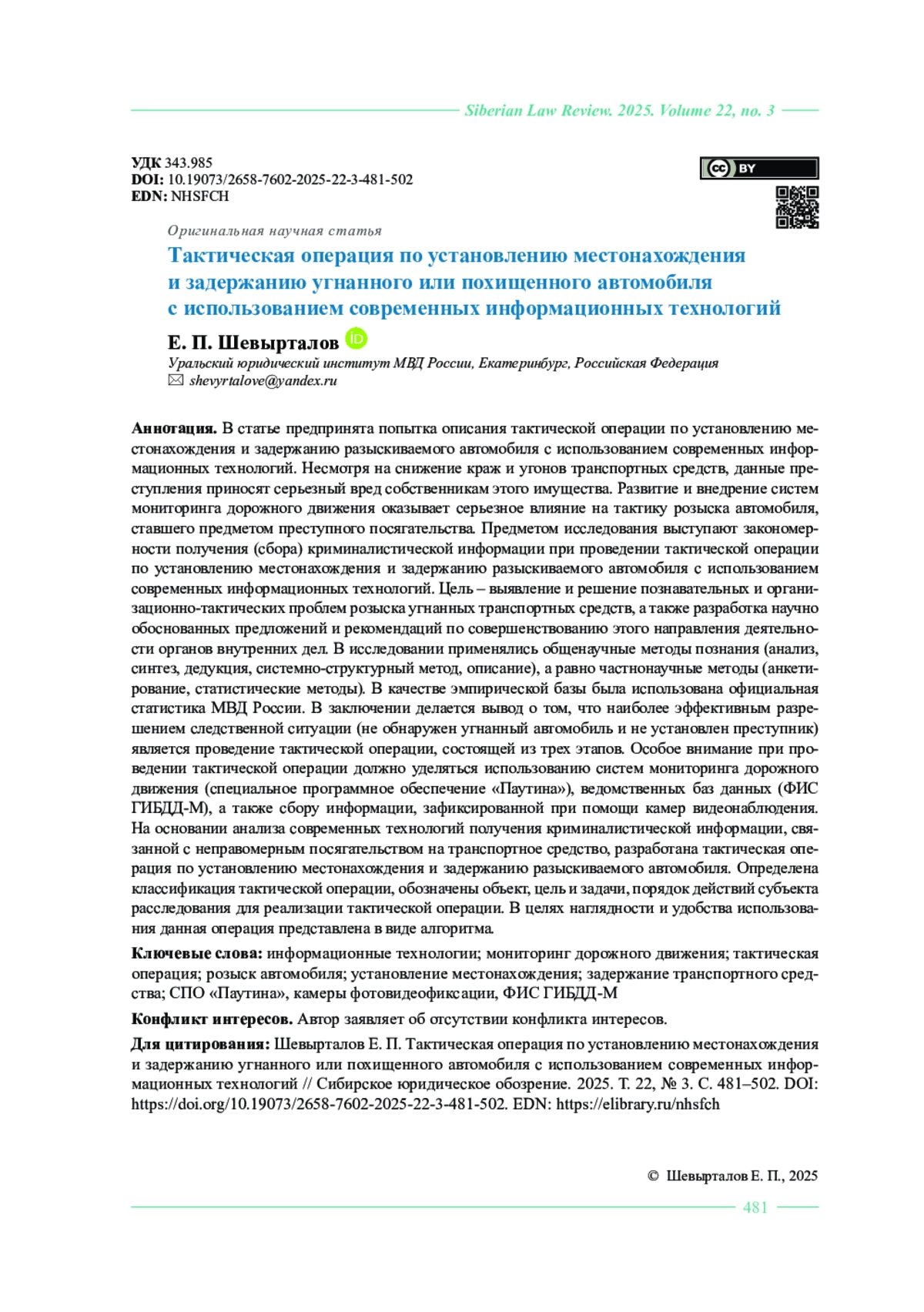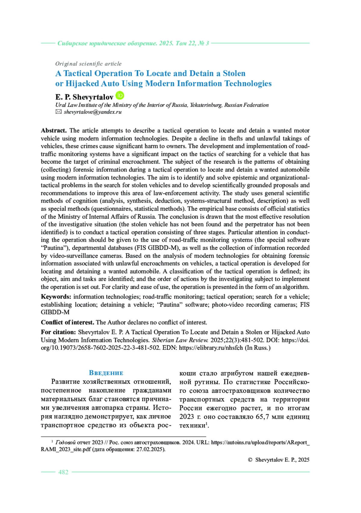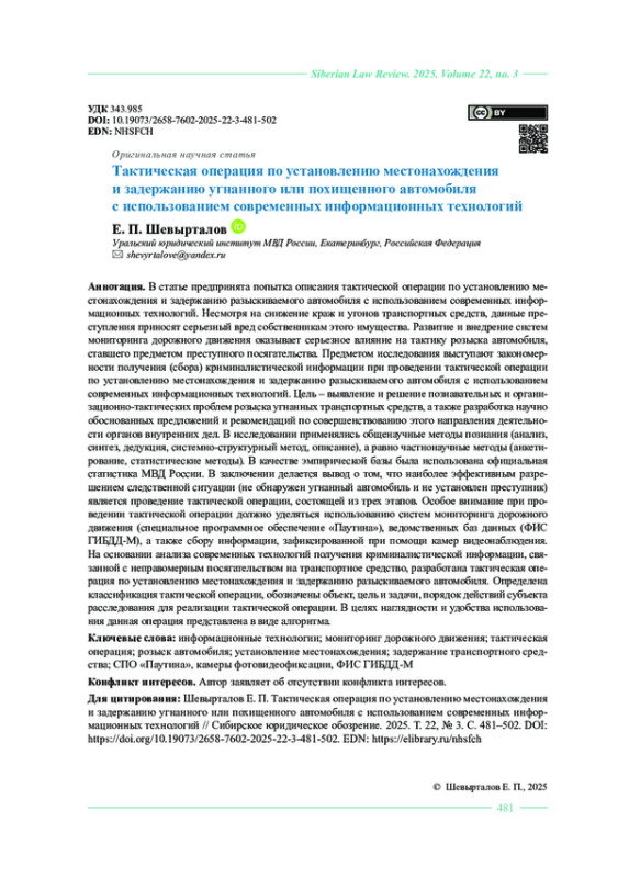 ШЕВЫРТАЛОВ Е. П. ТАКТИЧЕСКАЯ ОПЕРАЦИЯ ПО УСТАНОВЛЕНИЮ МЕСТОНАХОЖДЕНИЯ И ЗАДЕРЖАНИЮ УГНАННОГО ИЛИ ПОХИЩЕННОГО АВТОМОБИЛЯ С ИСПОЛЬЗОВАНИЕМ СОВРЕМЕННЫХ ИНФОРМАЦИОННЫХ ТЕХНОЛОГИЙ // СИБИРСКОЕ ЮРИДИЧЕСКОЕ ОБОЗРЕНИЕ. 2025. ТОМ 22, №3