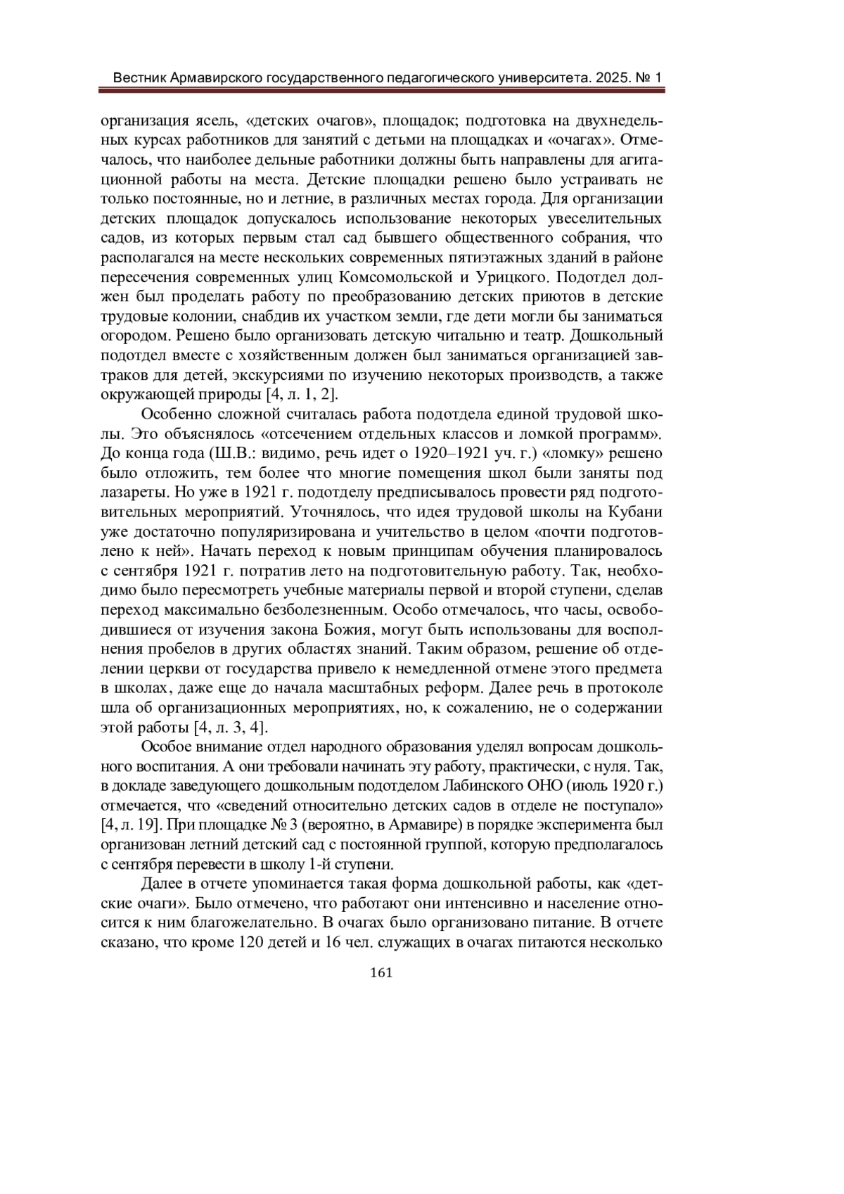 Статья посвящена истории деятельности отдела народного образования Армавирского революционного комитета с момента установления в городе советской власти в марте 1920 г. и в течение примерно первого года ее существования. В статье рассмотрены организационные мероприятия ревкома, направленные на создание системы народного образования и просвещения в Армавире, налаживание работы с учительским составом города, меры по ликвидации безграмотности, в том числе организация школ грамотности, пунктов ликбеза, элементы программы обучения безграмотных. Отдельно в статье уделено внимание мероприятиям по организации дошкольного воспитания. Уже в первый же год своего существования в Армавире советская власть в лице своих местных органов занялась и социально проблемными категориями детей и подростков, в том числе детьми с ограниченными возможностями здоровья и несовершеннолетними преступниками. В Армавире были организованы детские приюты, детские трудовые колонии, детские площадки.