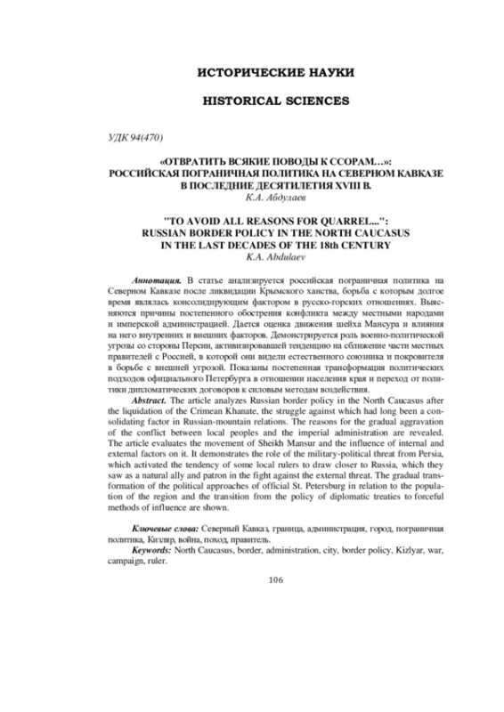 В статье анализируется российская пограничная политика на Северном Кавказе после ликвидации Крымского ханства, борьба с которым долгое время являлась консолидирующим фактором в русско-горских отношениях. Выясняются причины постепенного обострения конфликта между местными народами и имперской администрацией. Дается оценка движения шейха Мансура и влияния на него внутренних и внешних факторов. Демонстрируется роль военно-политической угрозы со стороны Персии, активизировавшей тенденцию на сближение части местных правителей с Россией, в которой они видели естественного союзника и покровителя в борьбе с внешней угрозой. Показаны постепенная трансформация политических подходов официального Петербурга в отношении населения края и переход от политики дипломатических договоров к силовым методам воздействия.