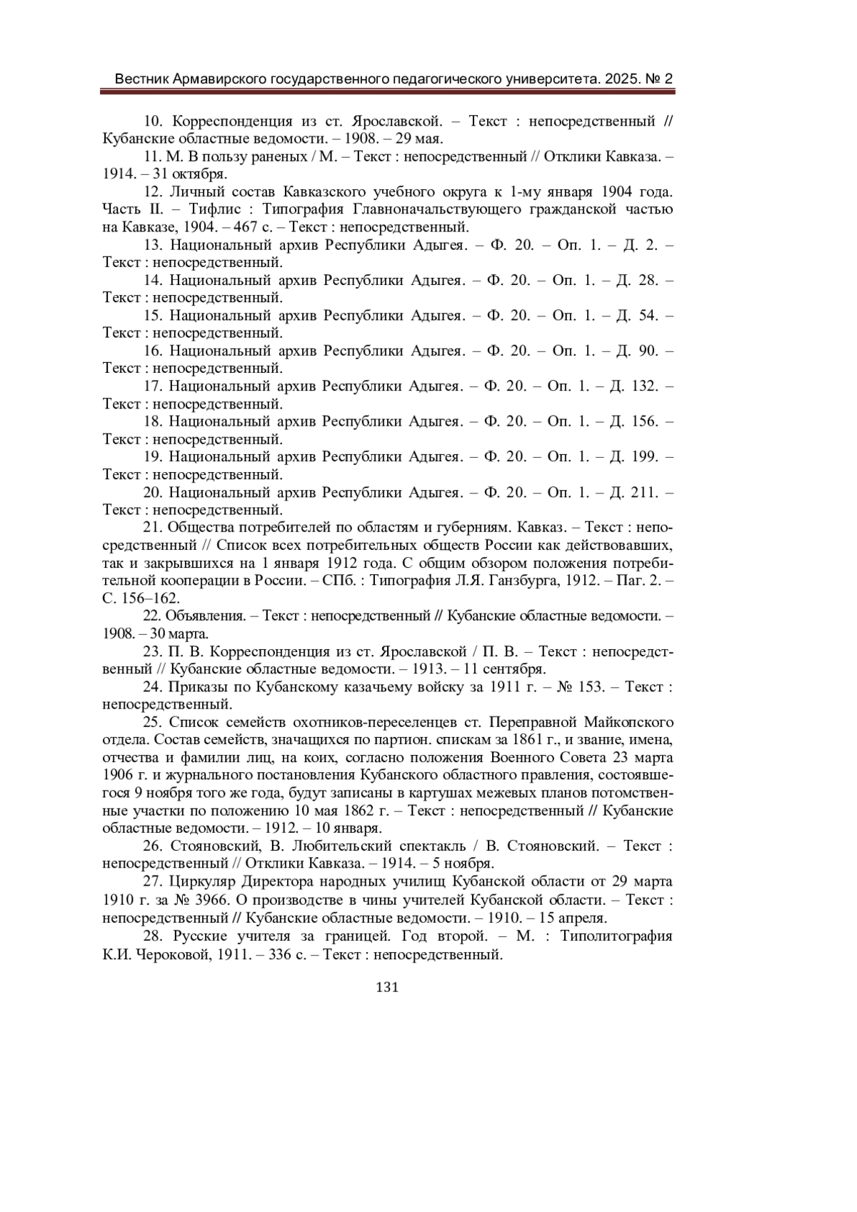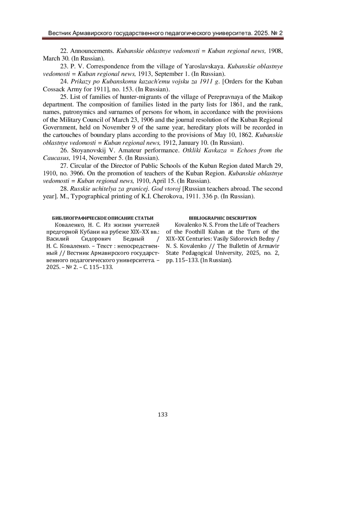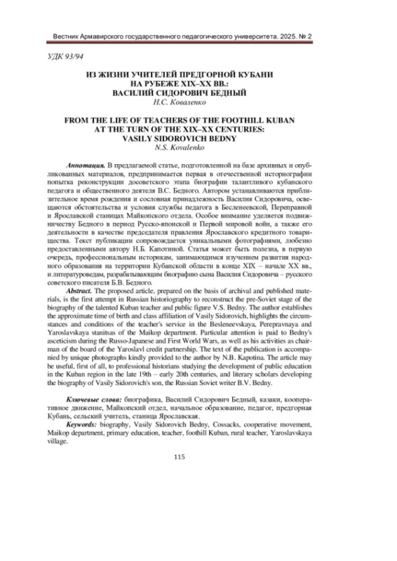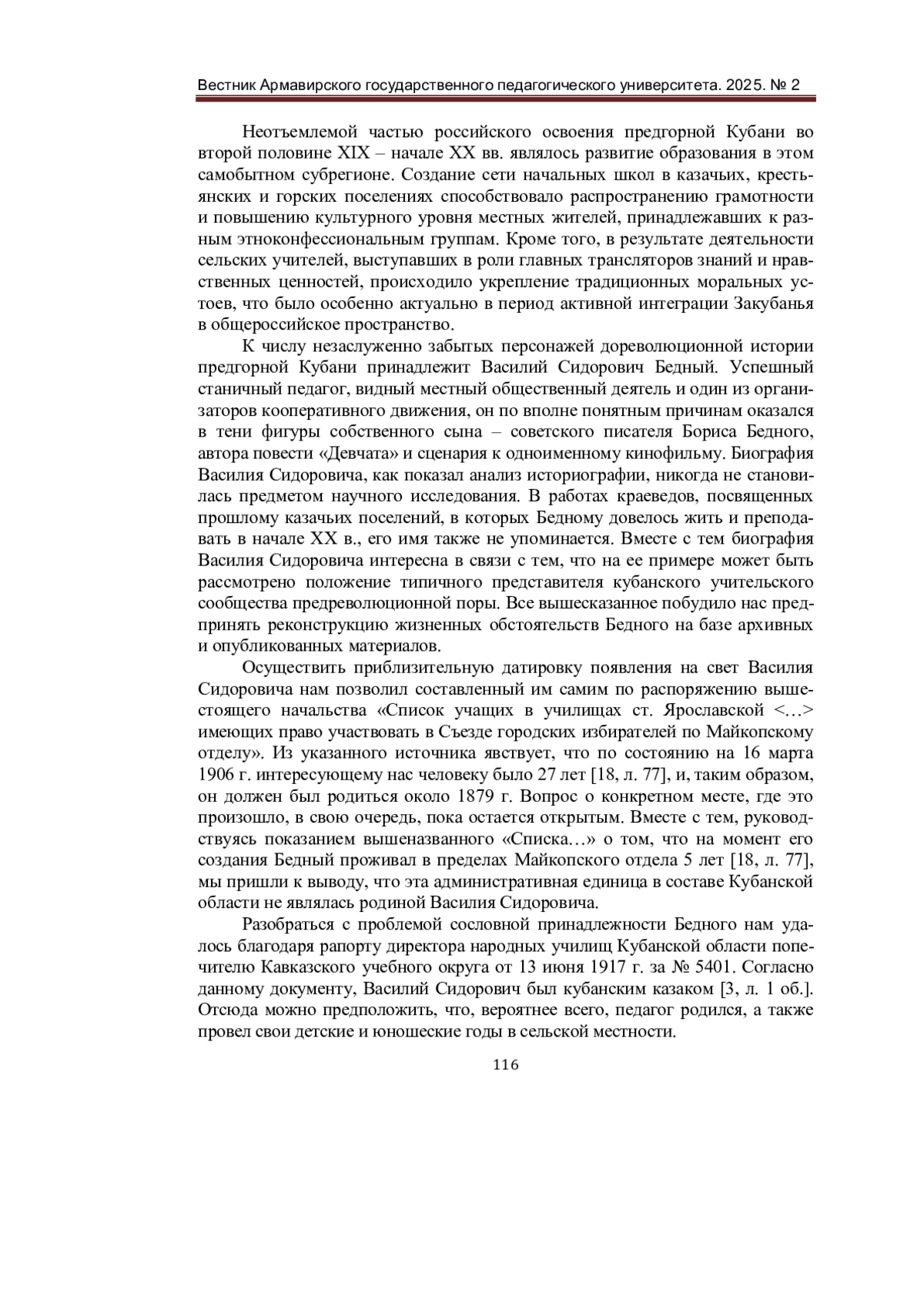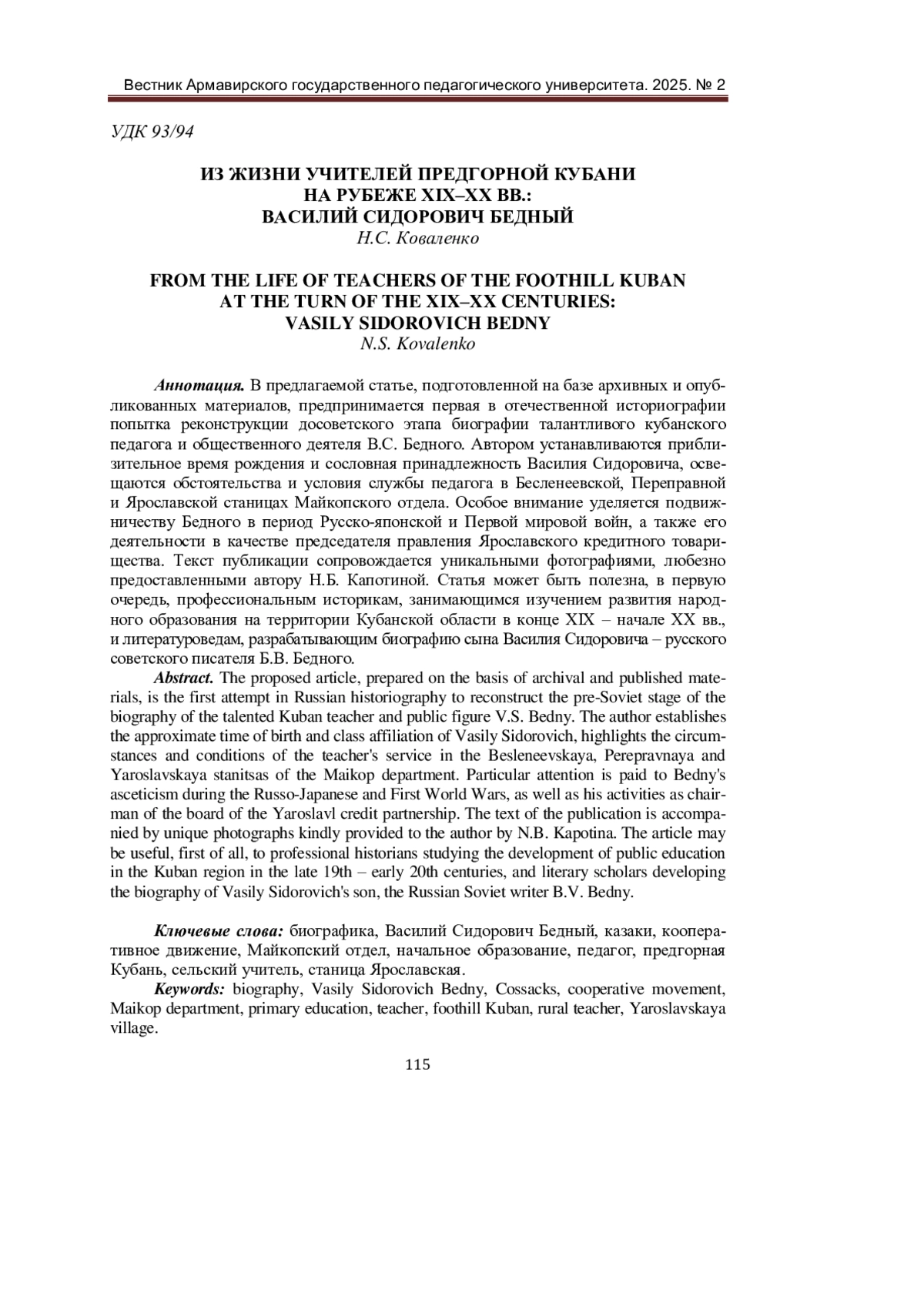 КОВАЛЕНКО Н. С. ИЗ ЖИЗНИ УЧИТЕЛЕЙ ПРЕДГОРНОЙ КУБАНИ НА РУБЕЖЕ XIX-XX ВВ.: ВАСИЛИЙ СИДОРОВИЧ БЕДНЫЙ // ВЕСТНИК АРМАВИРСКОГО ГОСУДАРСТВЕННОГО ПЕДАГОГИЧЕСКОГО УНИВЕРСИТЕТА. 2025. № 2