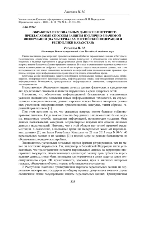 РАССОЛОВ И. М. ОБРАБОТКА ПЕРСОНАЛЬНЫХ ДАННЫХ В ИНТЕРНЕТЕ: ПРЕДЛАГАЕМЫЕ СПОСОБЫ ЗАЩИТЫ ПУБЛИЧНО-ЗНАЧИМОЙ ИНФОРМАЦИИ (НА МАТЕРИАЛАХ РОССИЙСКОЙ ФЕДЕРАЦИИ И РЕСПУБЛИКИ КАЗАХСТАН) // УЧЕНЫЕ ЗАПИСКИ КРЫМСКОГО ФЕДЕРАЛЬНОГО УНИВЕРСИТЕТА ИМЕНИ В. И. ВЕРНАДСКОГО. ЮРИДИЧЕСКИЕ НАУКИ. 2025. ТОМ 11(77). №1