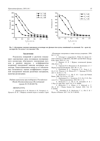 Результаты измерений и расчетов показывают однозначную связь потенциала изолированного коллектора, облучаемого электронным пучком в среднем вакууме, с коэффициентом вторичной электронной эмиссии материала коллектора. Такая взаимосвязь между φ и σ обеспечивает возможность оценки коэффициента вторичной электронной эмиссии различных материалов, включая диэлектрики.