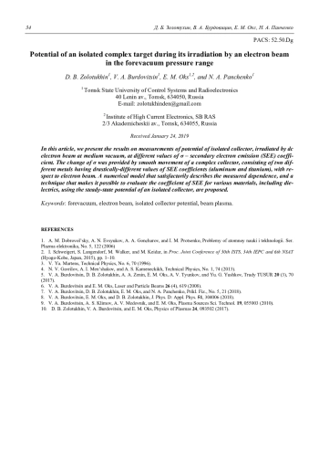 D. B. Zolotukhin, V. A. Burdovitsin, E. M. Oks, and N. A. Panchenko Potential of an isolated complex target during its irradiation by an electron beam in the forevacuum pressure range 30
