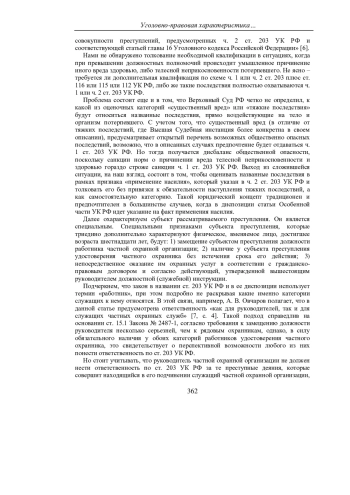 Статья посвящена комплексному исследованию объективных и субъективных признаков преступления, предусмотренного ст. 203 УК РФ. Дается оценка их законодательного закрепления. Исследуется их научное толкование в доктрине уголовного права. Обобщается судебное толкование признаков состава преступления, даваемое Верховным Судом Российской Федерации, а также судами общей юрисдикции при применении ст. 203 УК РФ на практике. Акцентируется внимание на отдельных нарушениях юридической конструкции признаков, указанных в ч. 2 ст. 203 УК РФ. Делается вывод о том, что подобные юридические пробелы влекут за собой искажение смысла данной нормы и препятствуют ее единообразному применению. Делается вывод о необходимости буквального, а не расширительного толкования объективных и субъективных признаков преступления, предусмотренного ст. 203 УК РФ, поскольку их расширительное толкование нарушает принципы системности и справедливости уголовного закона.