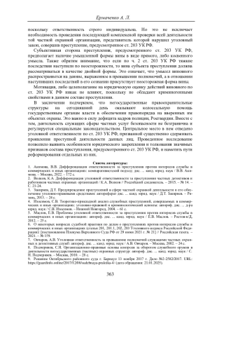 1. Акимова, В.В. Дифференциация ответственности за преступления против интересов службы в коммерческих и иных организациях: компаративистский подход: дис.. канд. юрид. наук / В.В. Аки мова. - Москва, 2022. - 172 с. EDN: OYNFJD