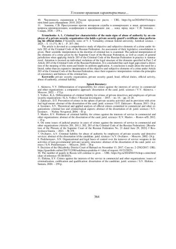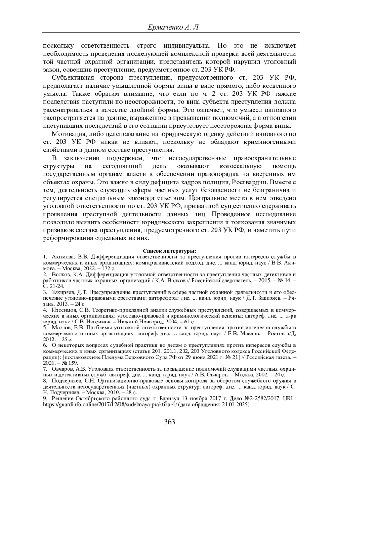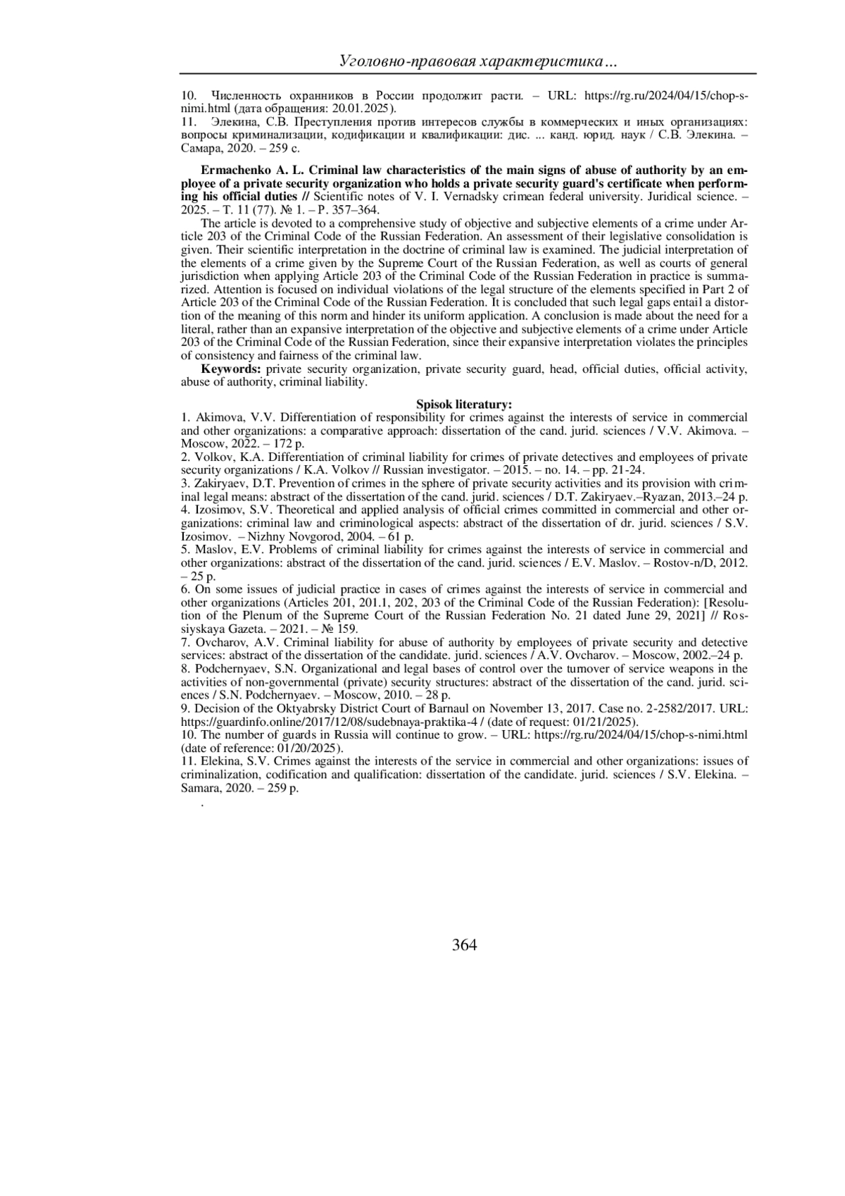10. Численность охранников в России продолжит расти. - URL: https://rg.ru/2024/04/15/chop-s-nimi.html (дата обращения: 20.01.2025). 11. Элекина, С.В. Преступления против интересов службы в коммерческих и иных организациях: вопросы криминализации, кодификации и квалификации: дис.. канд. юрид. наук / С.В. Элекина. - Самара, 2020. - 259 с. EDN: DPWALV