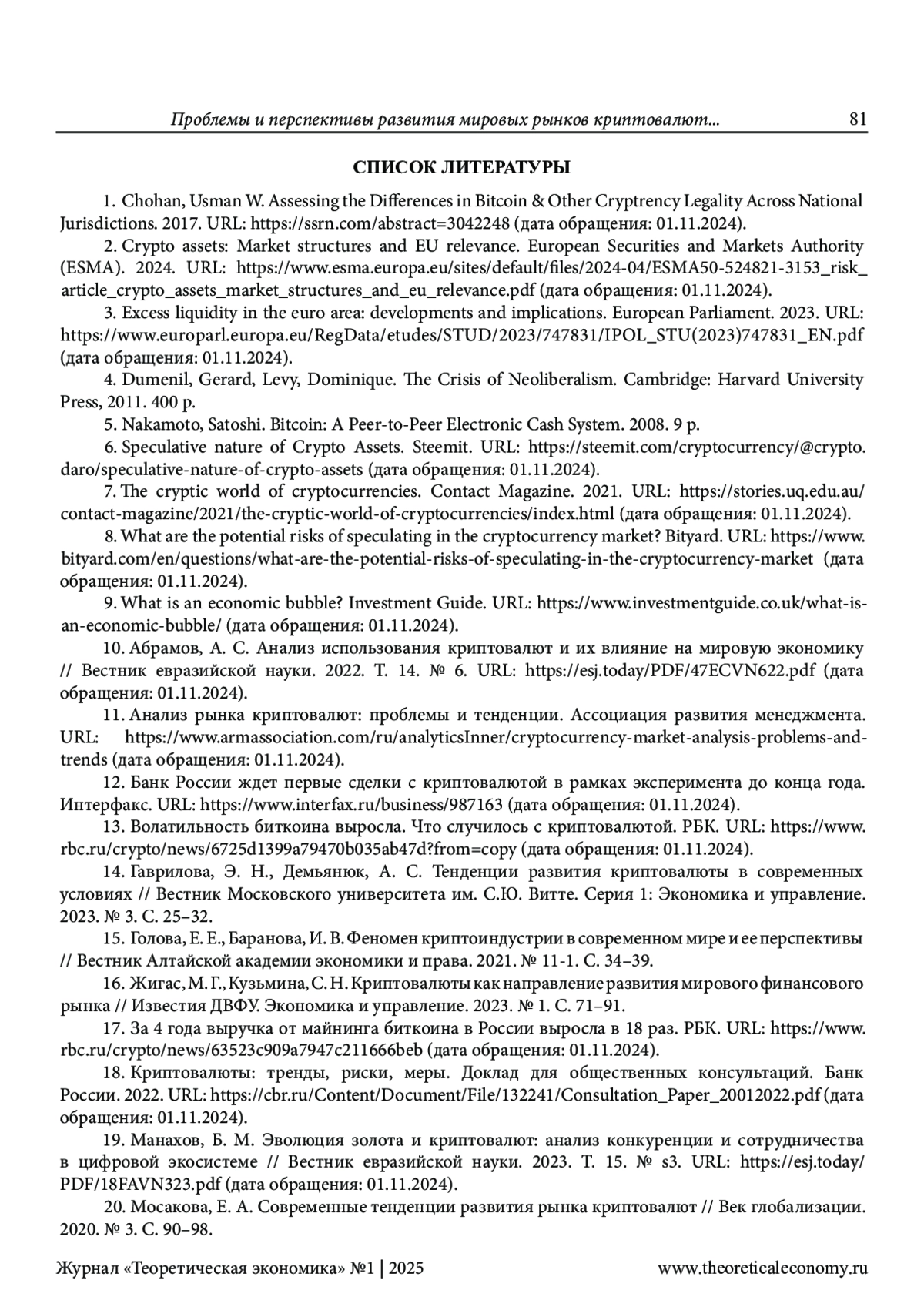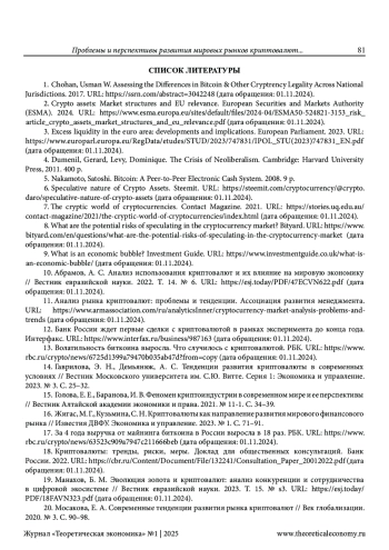 19. Манахов, Б. М. Эволюция золота и криптовалют: анализ конкуренции и сотрудничества в цифровой экосистеме // Вестник евразийской науки. 2023. Т. 15. № s3. URL: https://esj.today/PDF/18FAVN323.pdf (дата обращения: 01.11.2024). EDN: DRDPNH