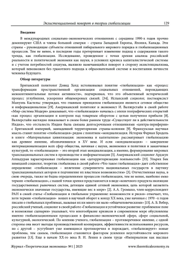 Британский политолог Дэвид Хелд истолковывал понятие «глобализации» как «процесс трансформации пространственной организации социальных отношений, порождающих межконтинентальные потоки активности», подчеркивая, что это объективный исторический процесс углубления, ускорения общемировых связей. [34]. Испанский социолог, постмарксист Мануэль Кастельс утверждал, что главным принципом глобализации является сетевое общество и информационализм [19]. Американский политолог и экономист И. Валлерстайн в своей работе «Мир-система Модерн» доказывает, что «глобализация» началась с эпохи географических открытий «как процесс организации и контроля над товарным оборотом с целью получения прибыли [8]. Валлерстайн наглядно показывает в своем более раннем труде «Существует ли в действительности Индия», что отсталость Индии была связана долгосрочными отношениями «центра-периферии» с Британской империей, завладевшей территориями страны-колонии [9].