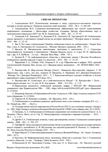1. Альпидовская М.Л. Политическая экономия в эпоху структур-но-системного перехода: история и логика процесса // Вопросы политиче-ской экономии. - 2022. - № 2. - С.180-195.