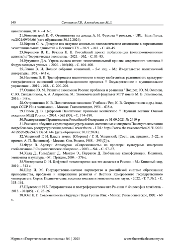 23. Корнилов В. И., Кукина Н. В. Российский проект глобализа-ции (политэкономические аспекты) // Теоретическая экономика. - 2021. - №2. - С. 81-93. EDN: HXPWNF