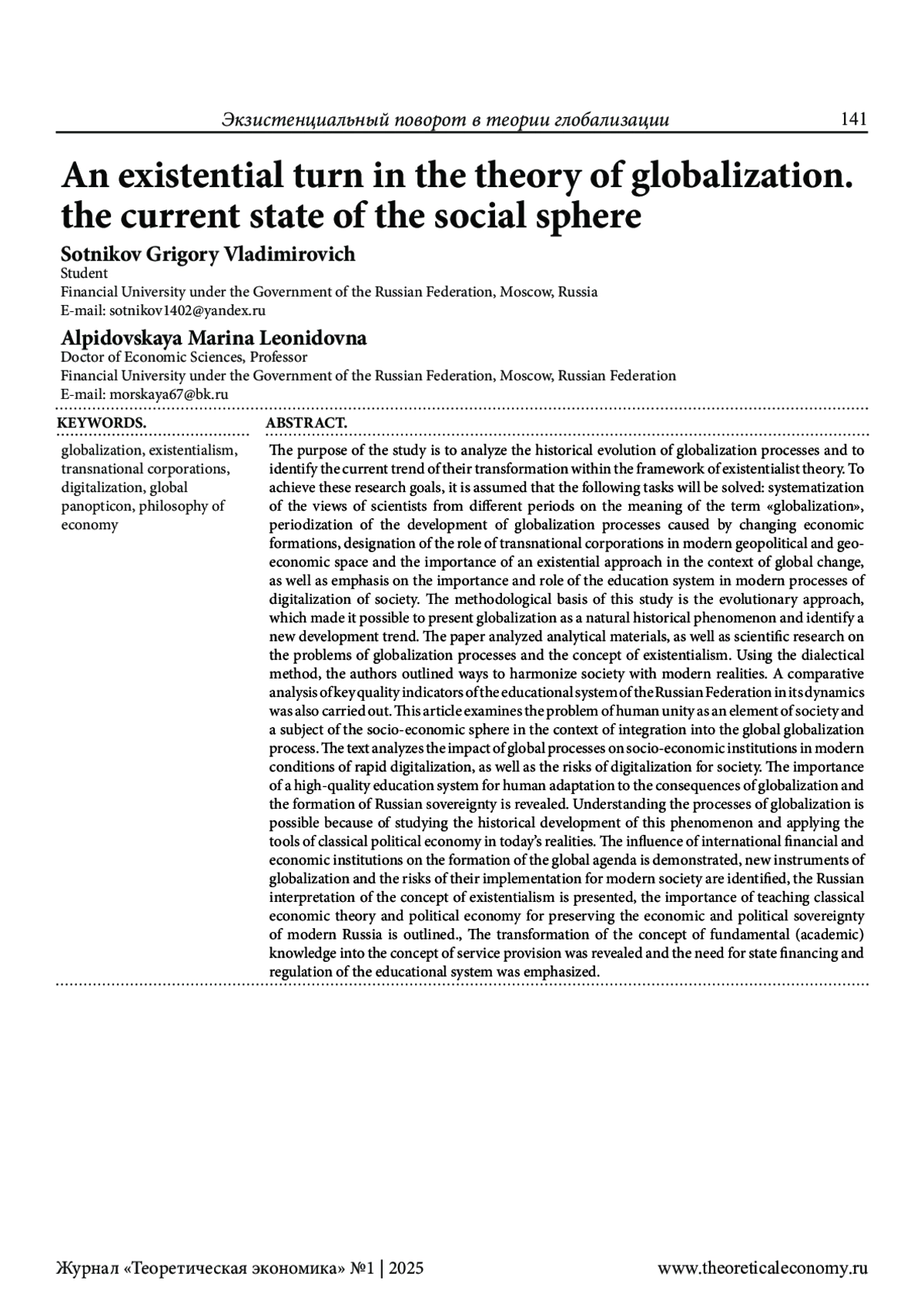 Целью исследования является анализ исторической эволюции процессов глобализации и выявление современной тенденции их трансформации в контексте экзистенциалистской концепции. Для достижения обозначенных целей исследования предполагается решение следующих задач: систематизация взглядов ученых разных периодов на значение термина «глобализация», периодизация развития глобализационных процессов, обусловленных сменой экономических формаций, обозначение роли транснациональных корпораций в современном геополитическом и геоэкономическом пространстве и важности экзистенциального подхода в условиях глобальных изменений, также акцентирование на значении и роли системы образования в современных процессах цифровизации общества. Методологической основой данного исследования выступает эволюционный подход, позволивший представить глобализацию как закономерное историческое явление и выявить новый тренд развития. В работе были проанализированы аналитические материалы, а также научные исследования, посвящённые проблематике глобализационных процессов и концепции экзистенциализма. С применением диалектического метода авторы наметили пути гармонизации общества с учетом современных реалий. Также был проведен сравнительный анализ ключевых показателей качества образовательной системы РФ в ее динамике. В данной статье исследуется проблема единства человека как элемента бытия общества и субъекта социально-экономической сферы в условиях встраивания в мировой глобализационный процесс. В тексте анализируются влияние глобальных процессов на социально-экономические институты в современных условиях стремительной цифровизации, а также сами риски цифровизации для социума в целом. Выявляется значение качественной системы образования для адаптации человека к последствиям глобализации и формирования суверенитета России. Понимание процессов глобализации осуществимо в результате изучения исторического развития данного явления и применения инструментария классической политической экономии в сегодняшних реалиях. Продемонстрировано влияние международных финансово-экономических институтов на формирование глобальной повестки, выявлены новые инструменты глобализации и риски их внедрения для современного общества, представлена русская интерпретация концепции экзистенциализма, обозначена важность преподавания классической экономической теории политической экономии для сохранения экономического и политического суверенитета современной России, обнаружена трансформация концепции фундаментальных (академических) знаний в концепцию оказания услуг и подчеркнута необходимость государственного финансирования и регулирования образовательной системы.