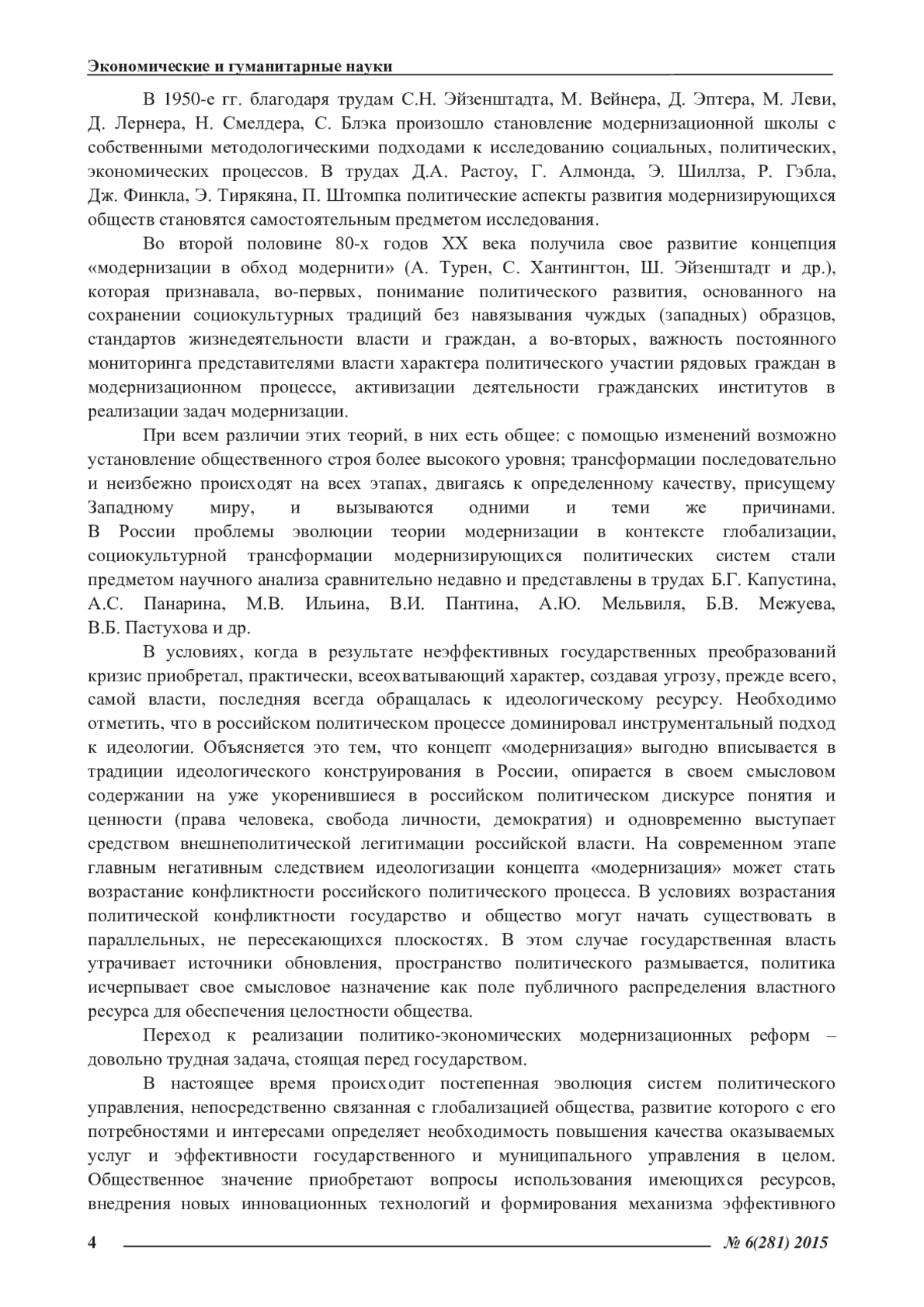Рассмотрены основные политико-философские характеристики концепта модернизация; выявлено, что становление модернизационной парадигмы связано с поиском теоретической модели, которая позволит объяснить и спрогнозировать политические, социальные, экономические процессы в обществах переходного типа. На примере современной России проведен анализ инструментария, посредством которого реализуются политологические концепты, в т. ч. модернизации.