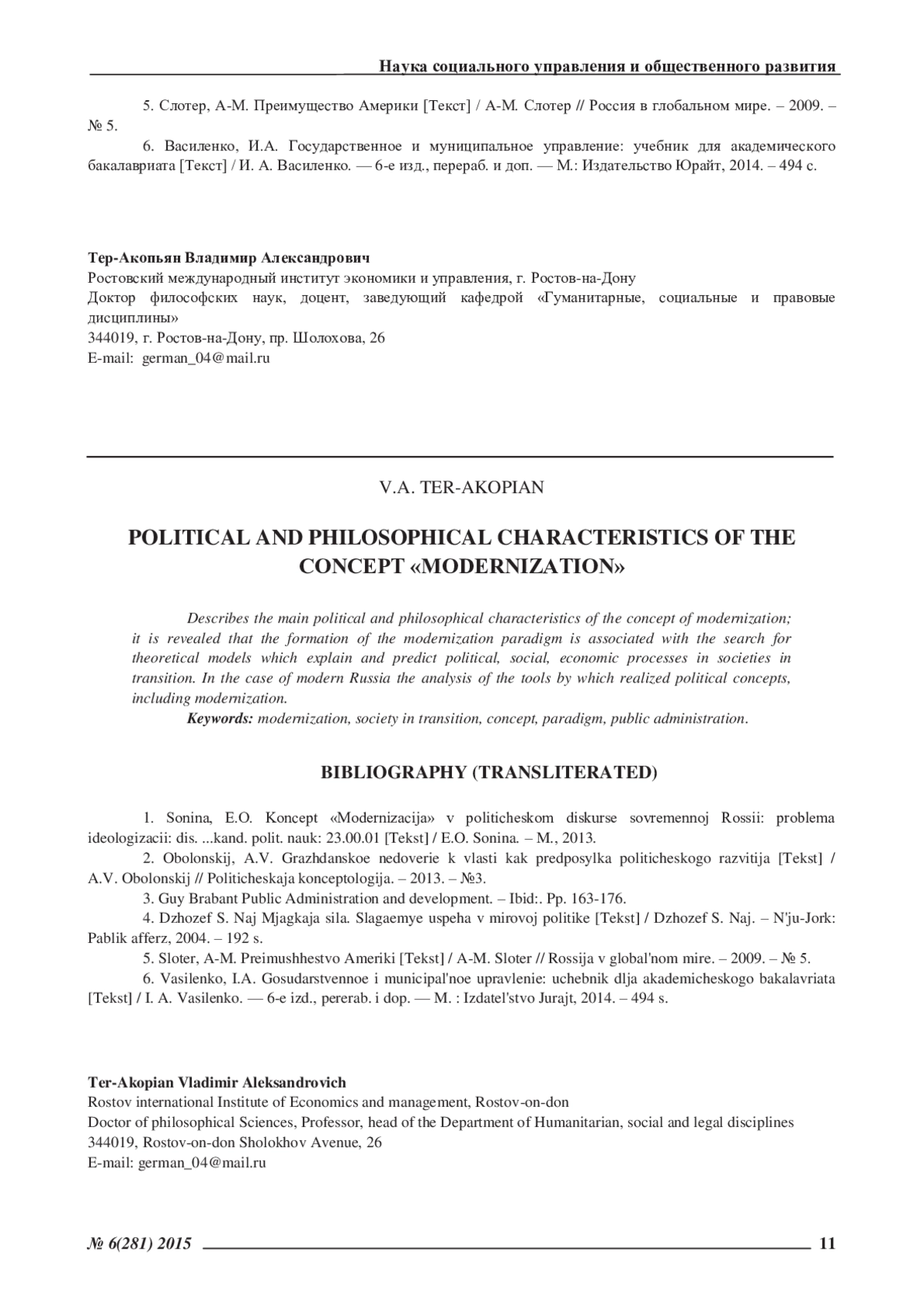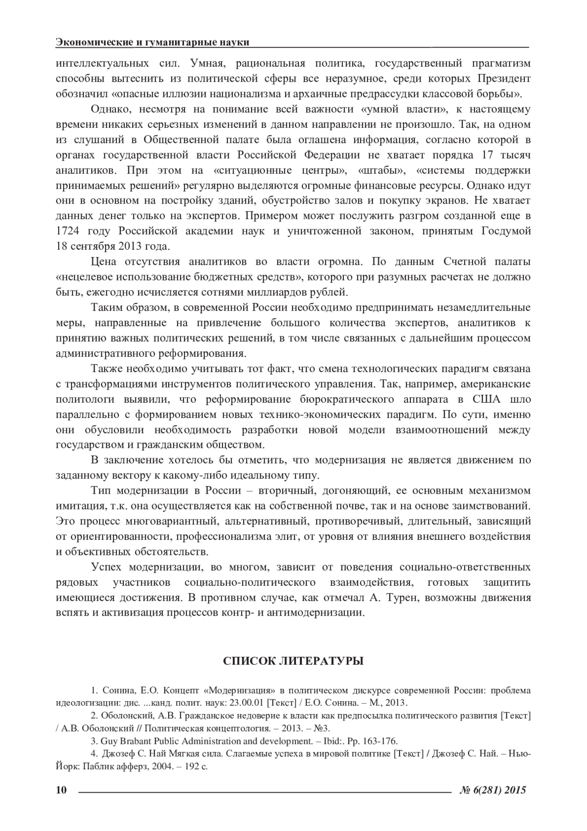 1. Сонина, Е.О. Концепт «Модернизация» в политическом дискурсе современной России: проблема идеологизации: дис..канд. полит. наук: 23.00.01 [Текст] / Е.О. Сонина. - М., 2013. EDN: SUVIQV