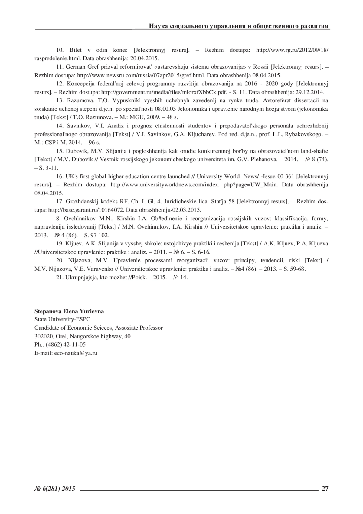 18. Овчинников, М.Н. Объединение и реорганизация российских вузов: классификация, формы, направления исследований /М.Н. Овчинников, И.А. Киршин//Университетское управление: практика и анализ. -2013. -№ 4 (86). -С. 97-102. EDN: RVQMAD