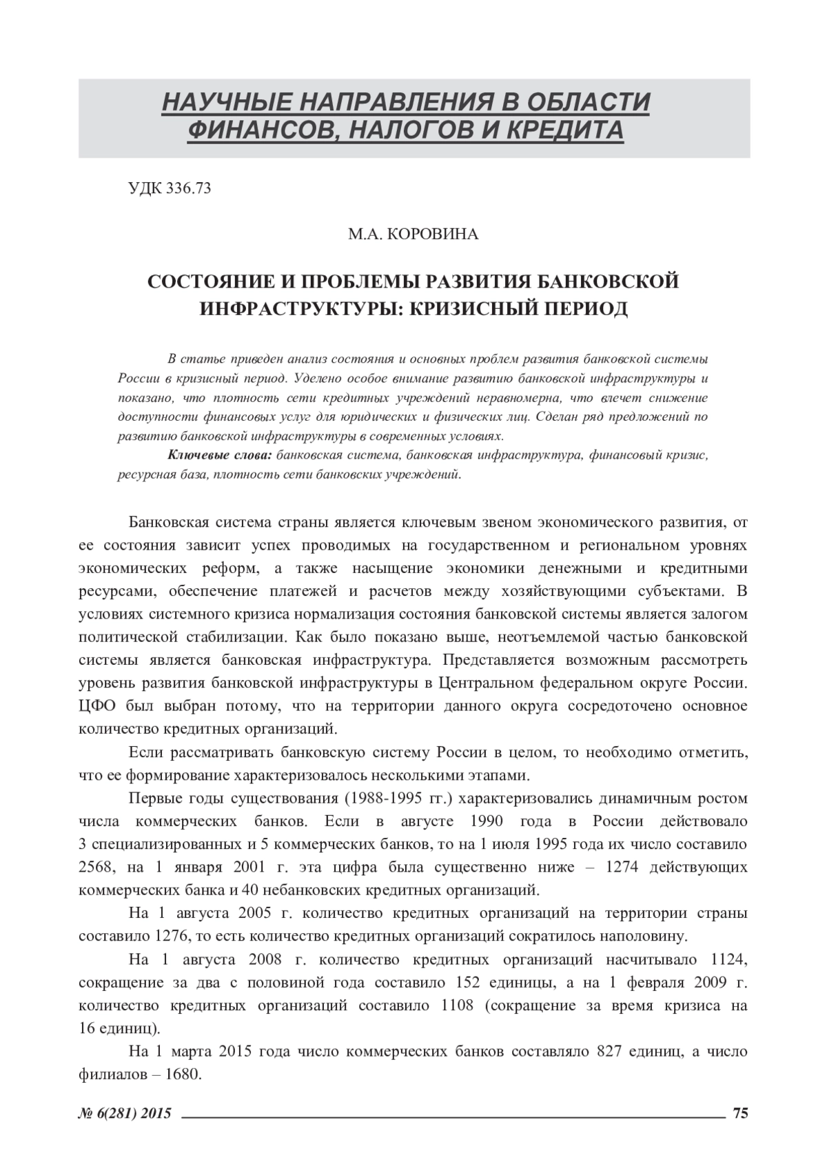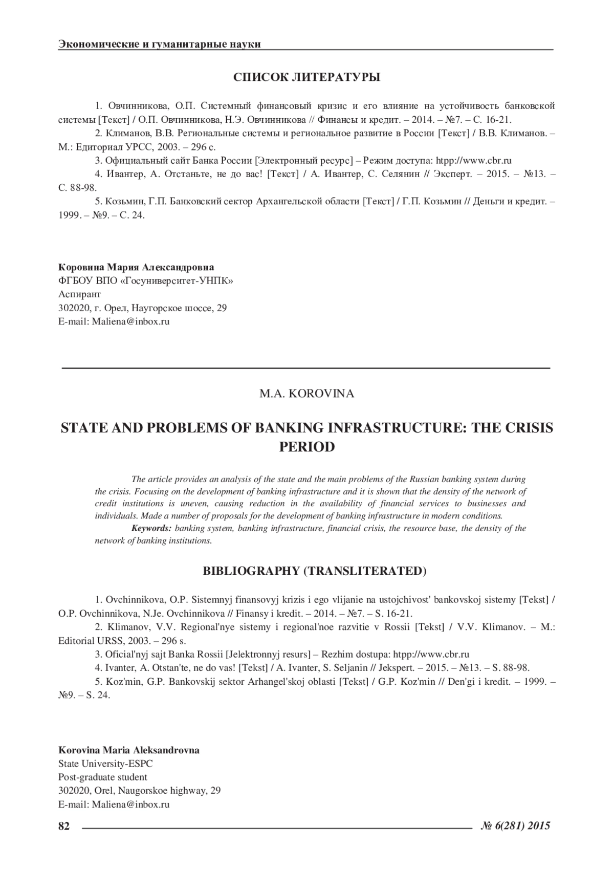 1. Овчинникова, О.П. Системный финансовый кризис и его влияние на устойчивость банковской системы [Текст] / О.П. Овчинникова, Н.Э. Овчинникова // Финансы и кредит. - 2014. - №7. - С. 16-21. EDN: RVADGH