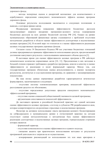 В статье осуществлен анализ существующих подходов к оценке эффективности целевых программ на примере дорожного фонда. Определены основные подходы к разработке методики оценки эффективности целевых программ дорожного фонда: комплексный, интегральный, иерархично-кумулятивный. Предложены критерии определения показателей эффективности целевых программ дорожного фонда с учетом бюджетного, социального, управленческого и экономического эффектов. Обозначены преимущества процесса использования средств дорожного фонда в практике программно-целевого бюджетирования