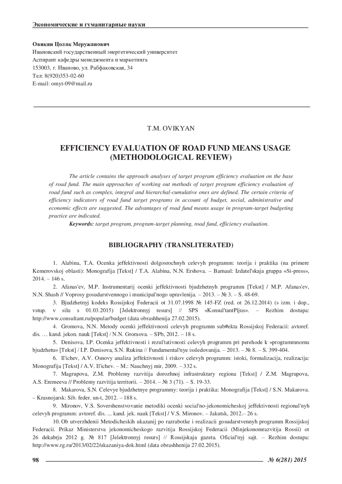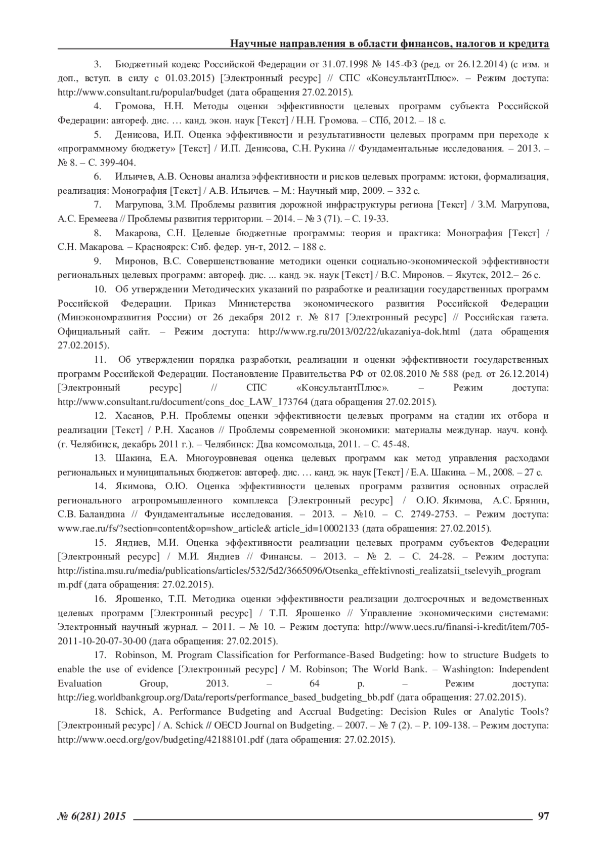 15. Яндиев, М.И. Оценка эффективности реализации целевых программ субъектов Федерации /М.И. Яндиев//Финансы. -2013. -№ 2. -С. 24-28. -Режим доступа: http://istina.msu.ru/media/publications/articles/532/5d2/3665096/Otsenka_effektivnosti_realizatsii_tselevyih_program m.pdf (дата обращения: 27.02.2015). EDN: PXRZTZ